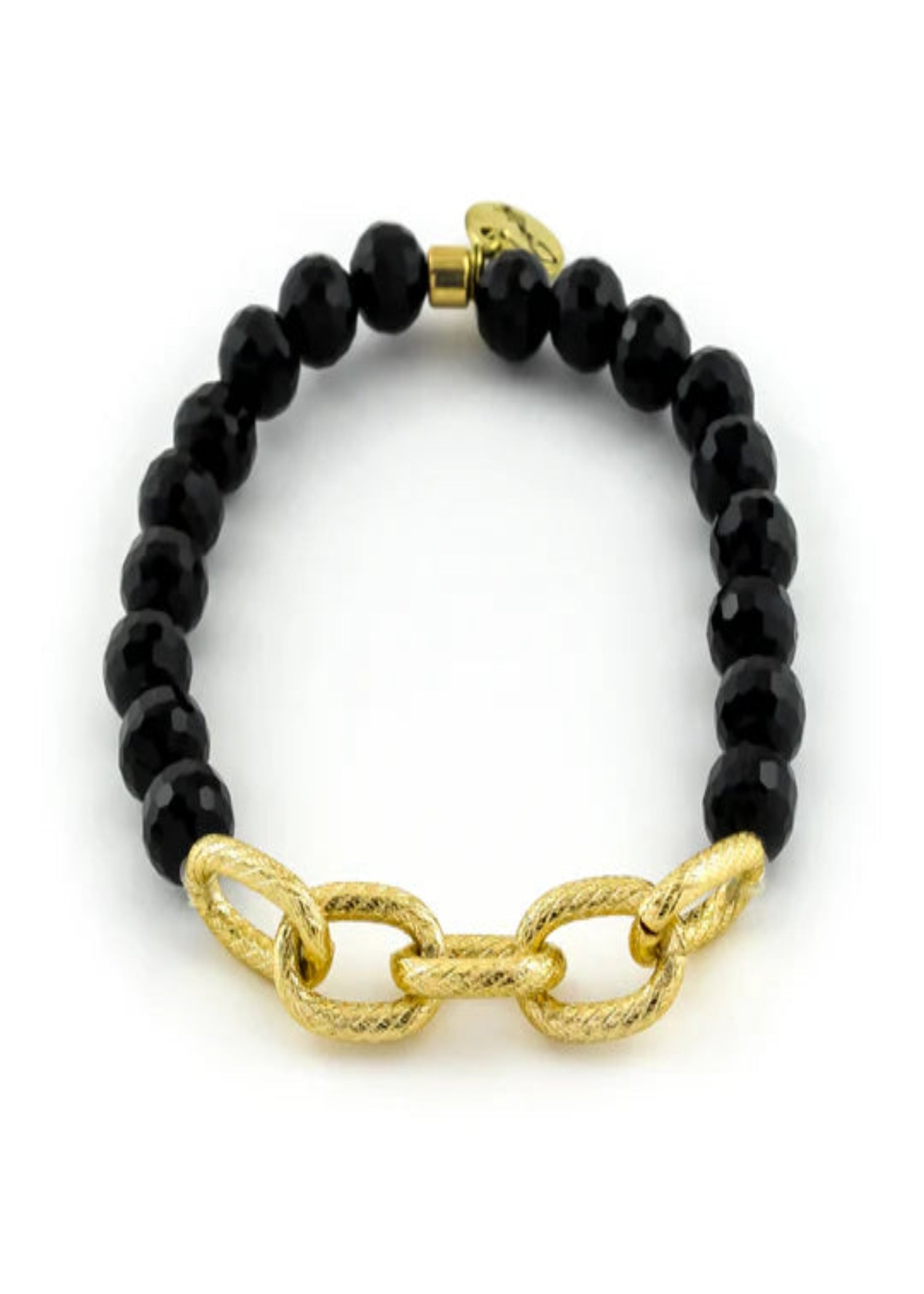 Get ready to show off your school spirit with Ace Gameday Bracelets! Featuring black crystal beads and gold link chains, this bracelet is perfect for adding a touch of team or school colors to your game day outfit. Each bracelet is stretchy, easy to wear, and designed to fit most wrists. Plus, it's lead and nickel free for comfortable and worry-free wear.