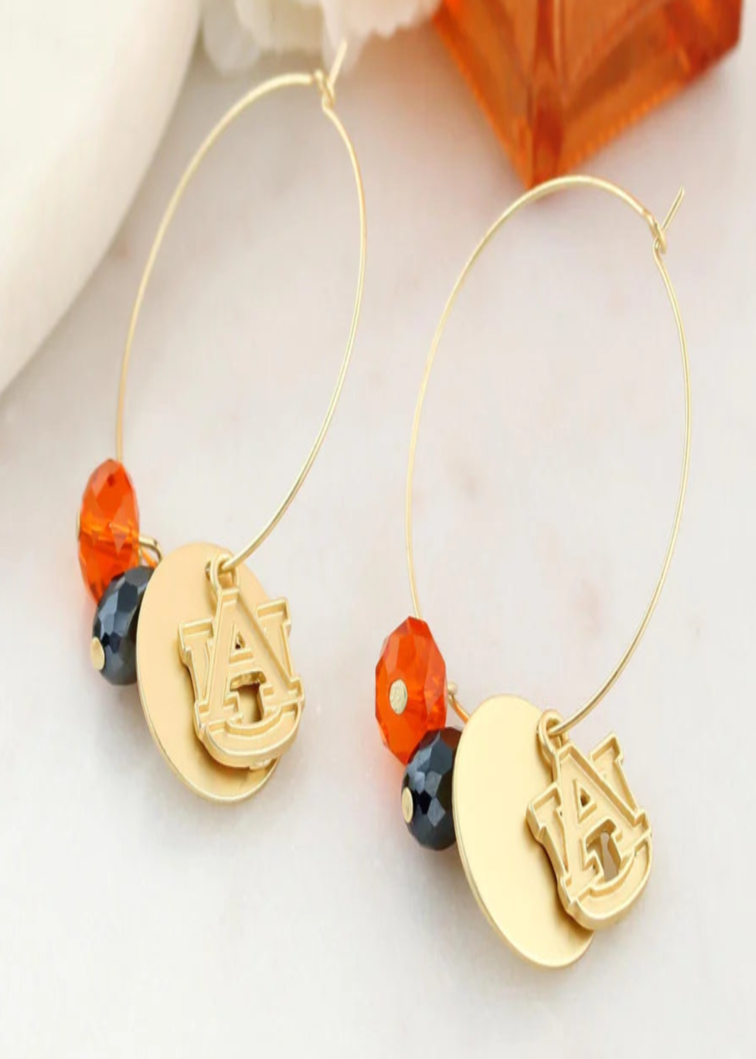 Elevate your game day look with these stunning Auburn University hoop earrings! Featuring matte gold hoops adorned with beautiful orange and navy crystal beads, a gold disc, and the iconic Auburn logo charm, these earrings are a must-have for any Tigers fan. The perfect blend of style and team spirit, these hoops are 1.5" in diameter and are an officially licensed Collegiate by Seasons product. Show your love for your team in a chic and sophisticated way with these earrings. War Eagle!