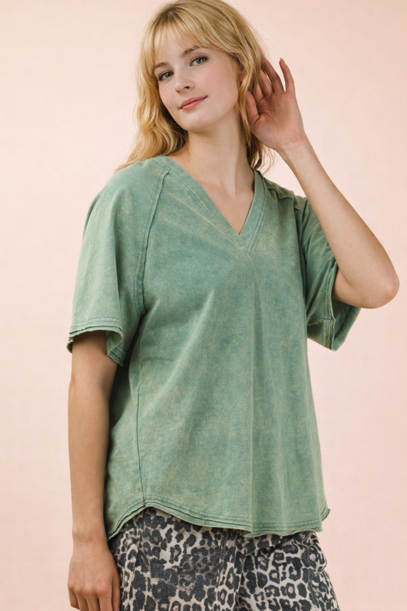 Back Shirring Detail Mineral Washed Knit Top in Sage