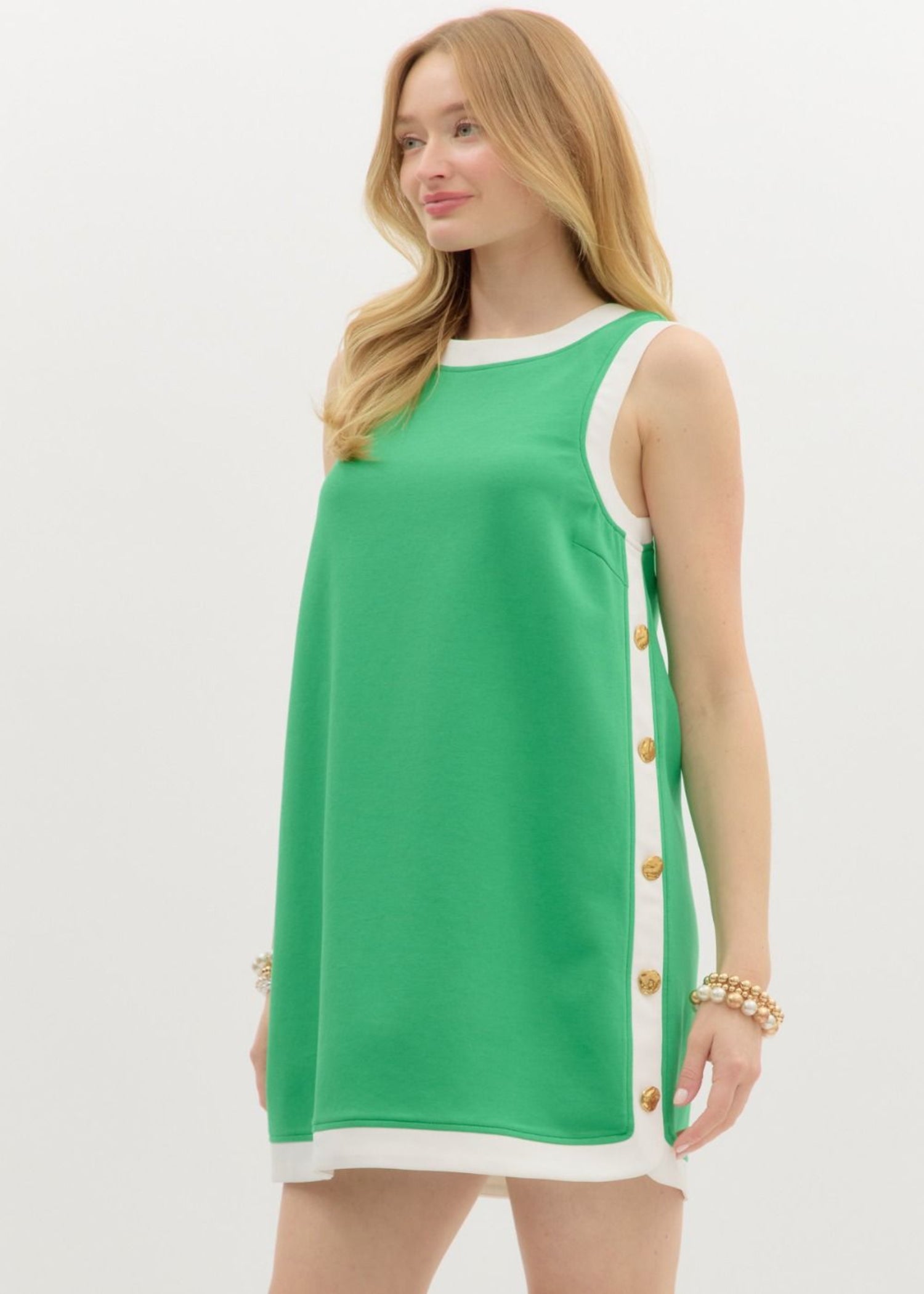 Solid sleeveless mini dress featuring gold accented button at side over contrast band. Lined. Knit. Non-sheer. Lightweight.