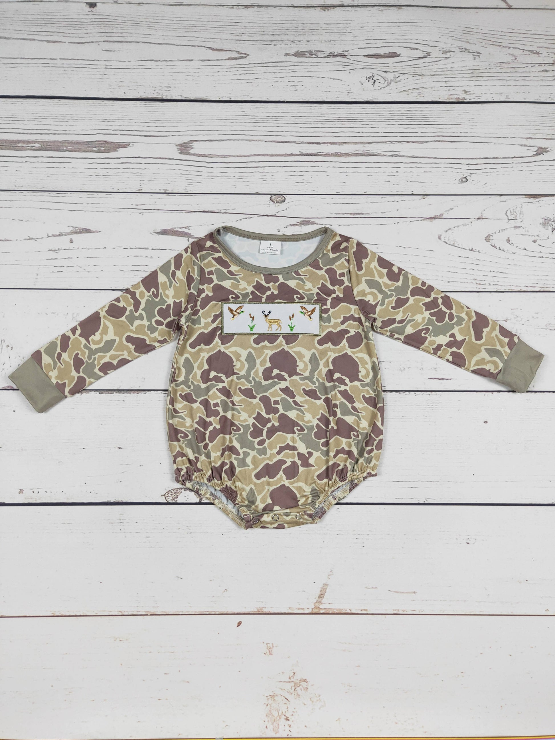 Boy Duck Deer Appliqué Camouflage Romper ETA: 5-7 Days this camouflage romper features a playful appliqué design of a boy, duck, and deer. With its durable and comfortable fabric, this romper is perfect for your little one's daily adventures. Plus, with an estimated delivery ETA of just 5-7 days, you'll have this adorable romper in no time for your child to enjoy!