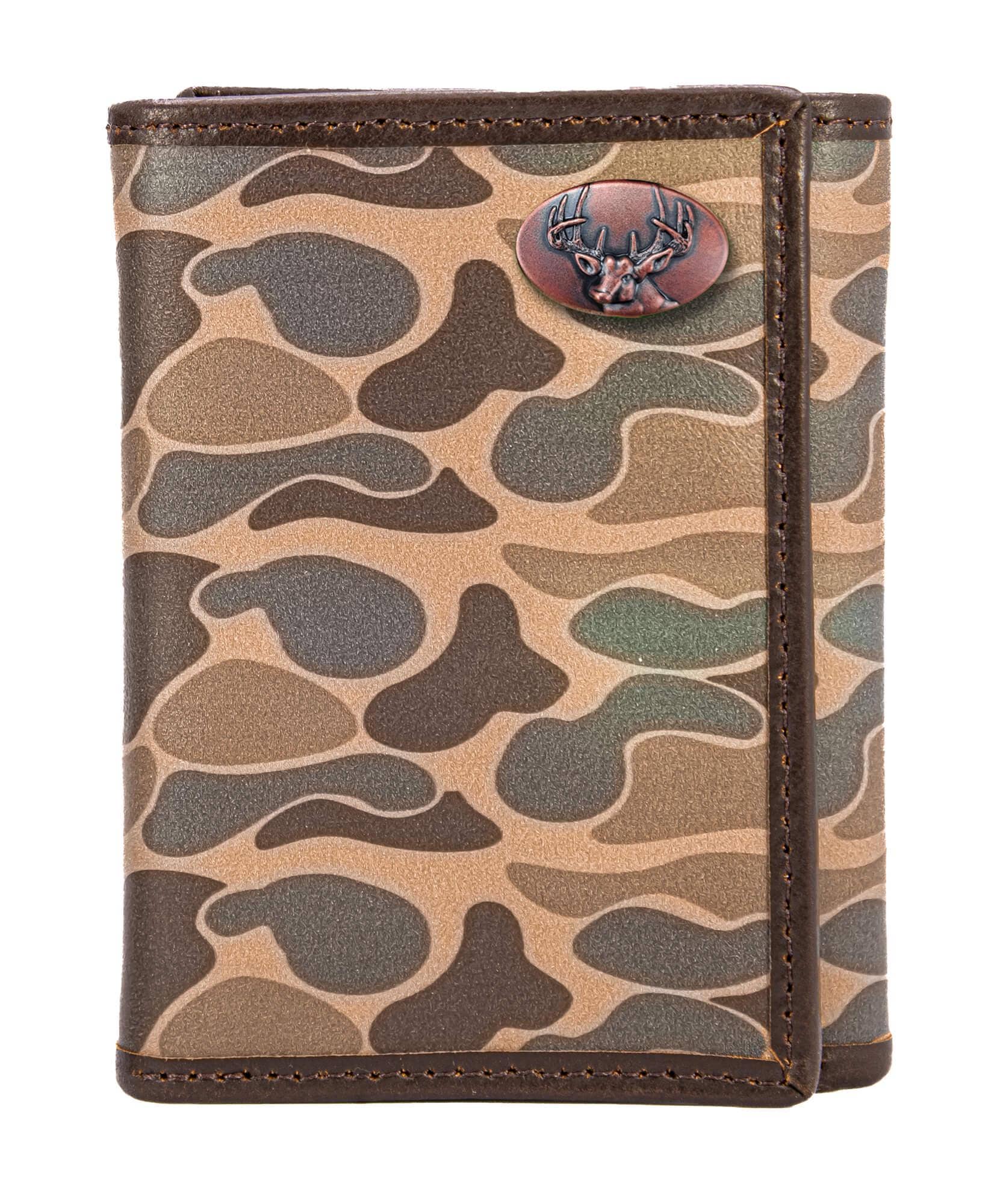 Show your passion with an original Zep-Pro leather trifold wallet featuring a Buck design. The deer imagery on these wallets taps into our intrinsic connection to nature and wildlife. It is a stylish and unique way to show enthusiasm while keeping important cards and cash organized. This Zep-Pro wallet is constructed of full grain leather with an Old School Camo print and features the Buck metal logo, proudly displayed on the front upper right corner. The metal concho emblem has an antique copper finish which perfectly accents this unique wallet.