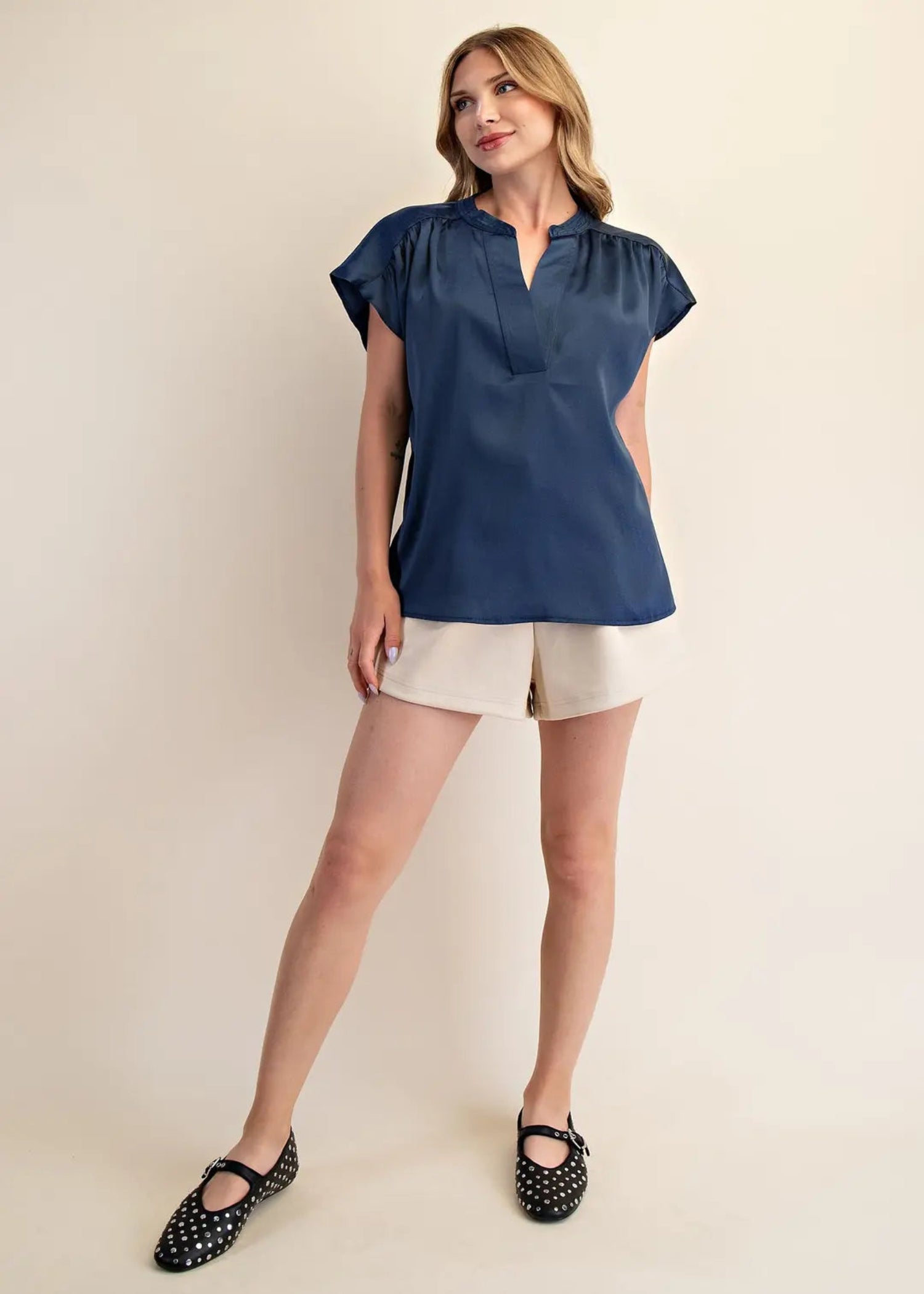 Elevate your wardrobe with the CAMI Round Neck Top in Navy. This versatile blouse features a flattering round neckline and a subtle V-neck drop, crafted from smooth satin that adds a touch of elegance. Perfect for both casual and dressy occasions, its lightweight fabric ensures comfort while enhancing your style effortlessly. Make a sophisticated statement with this timeless piece.