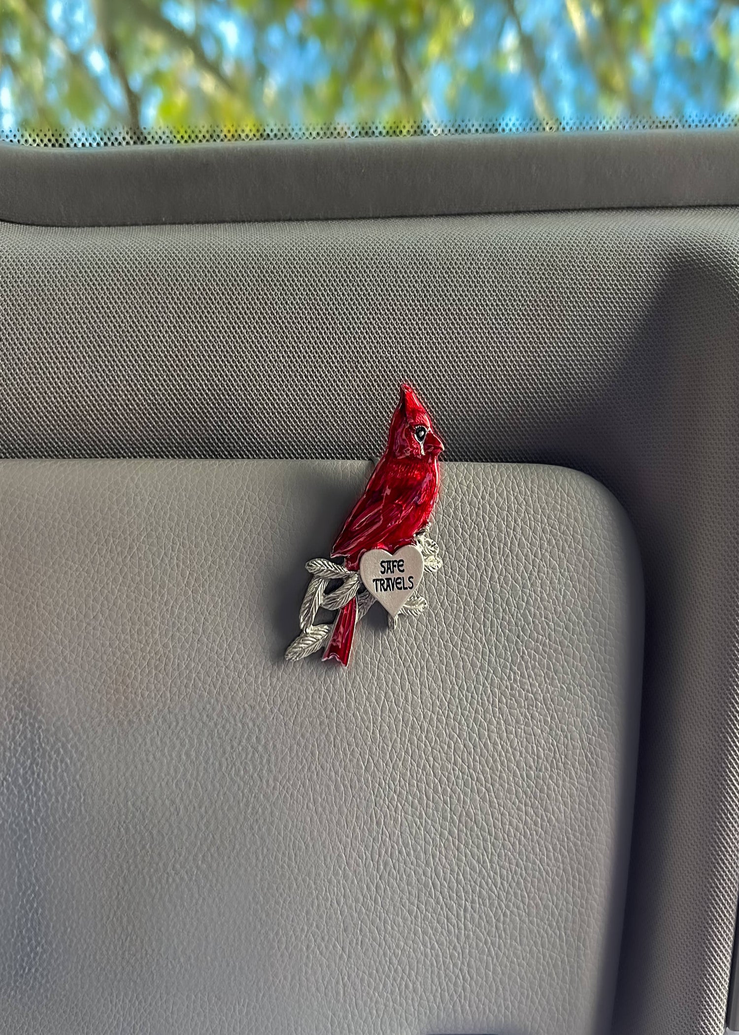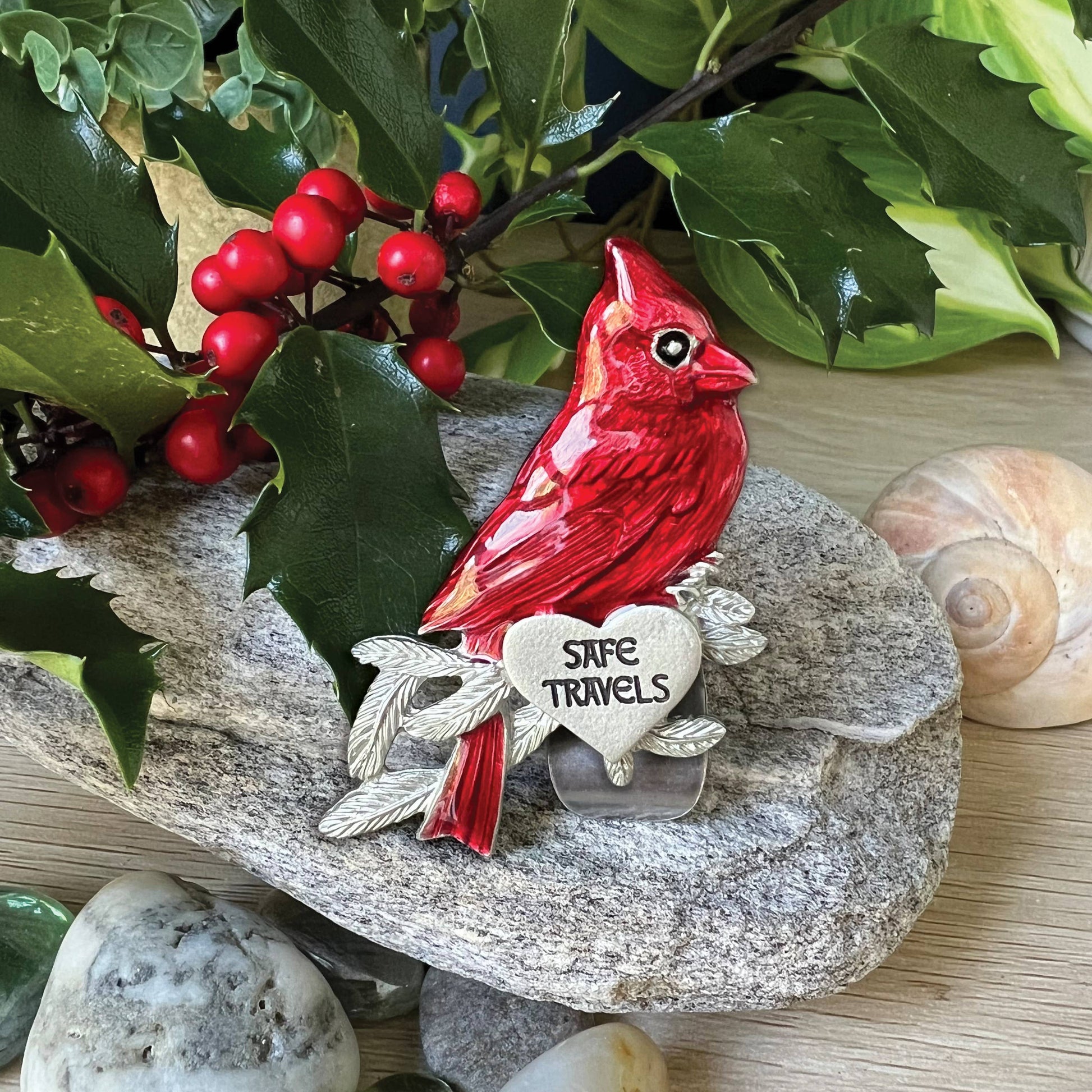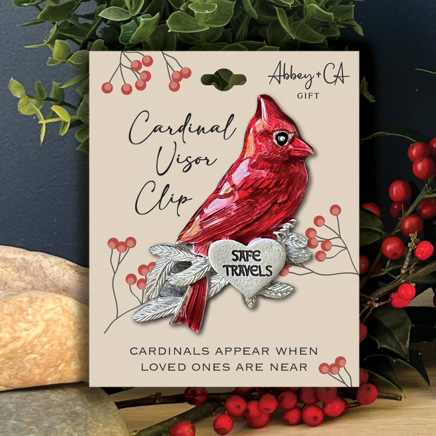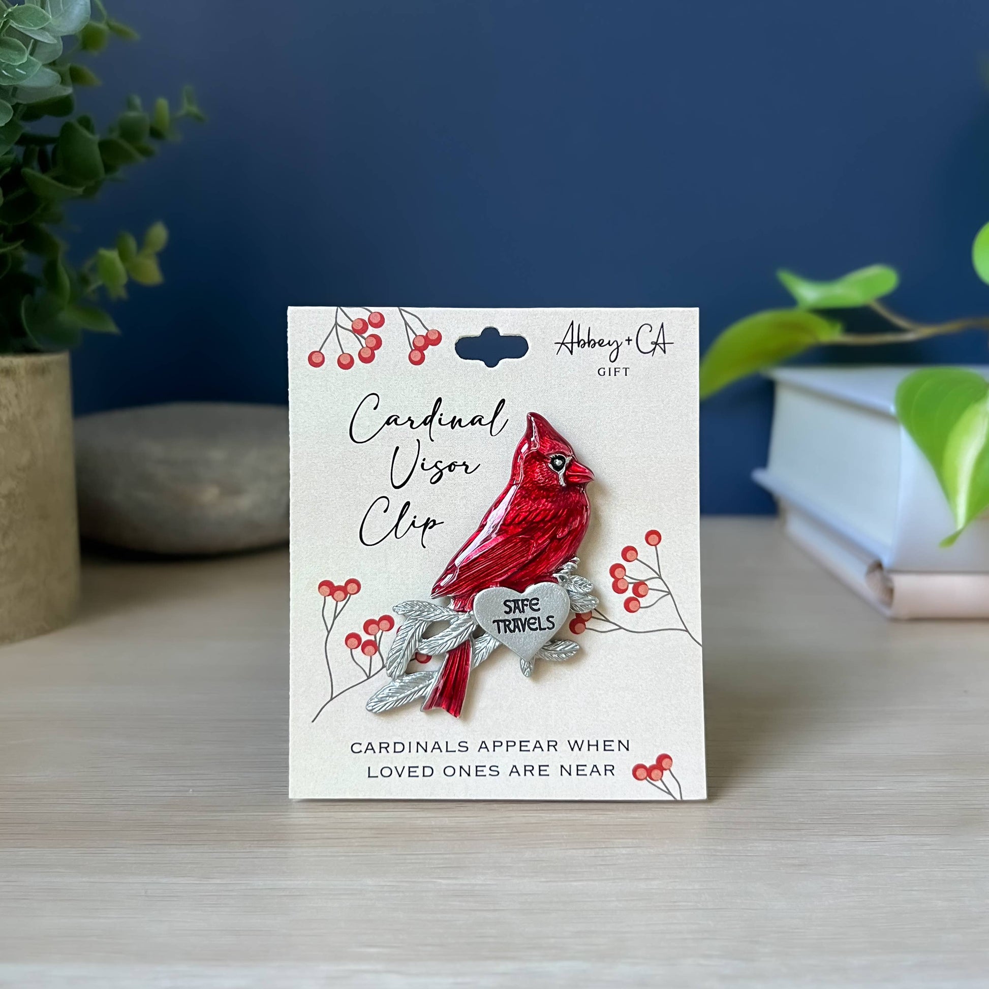 Cardinal visor clip crafted of cast metal in silver enamel finish, with red epoxy.
