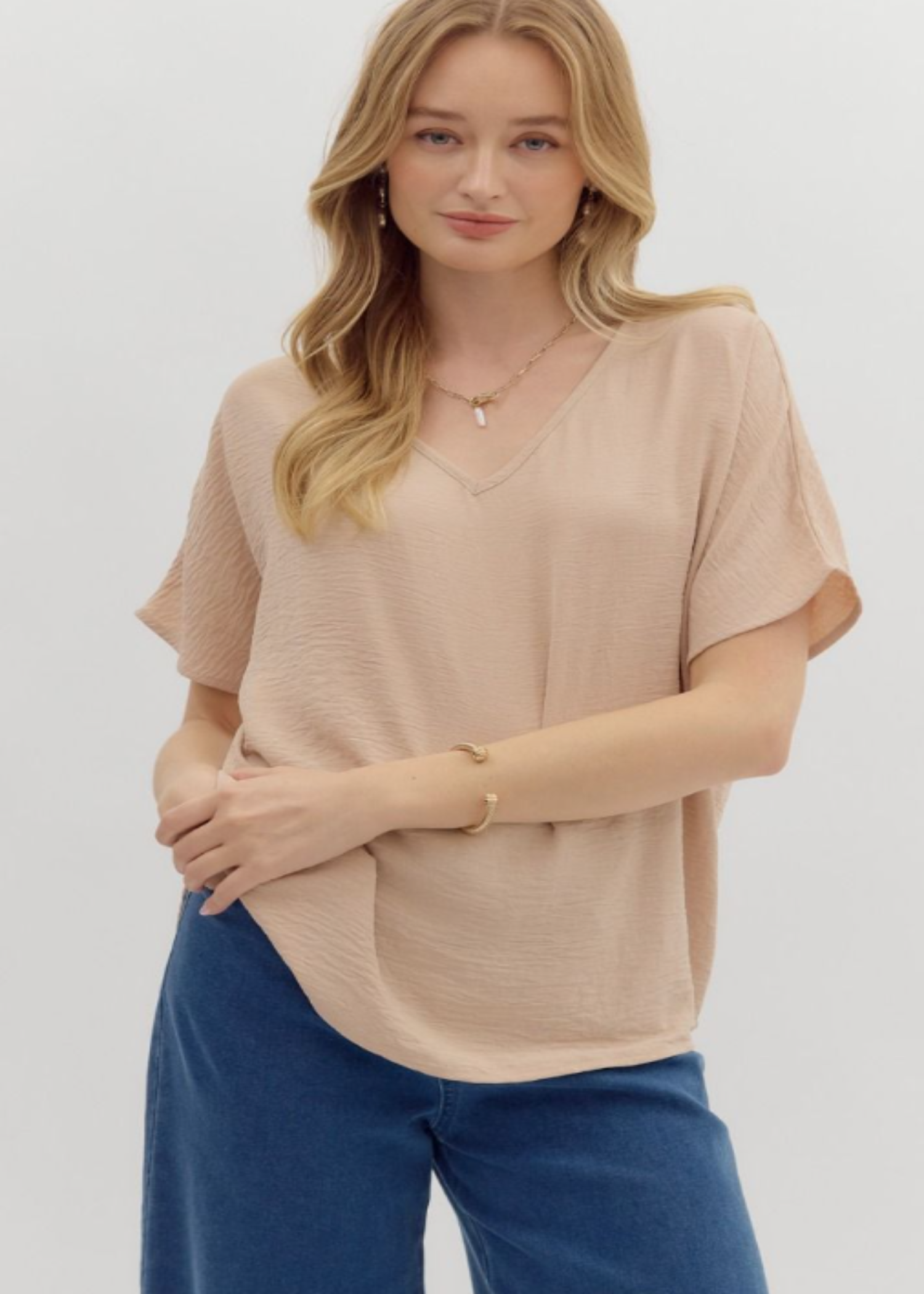 Elevate your everyday style with the Cassie V-Neck Top in Toast. Its flattering V-neckline and soft, warm-toned fabric offer both comfort and a chic, effortless look. Perfect for layering or wearing solo, this versatile top easily transitions from casual outings to polished office wear, making it a must-have staple in your wardrobe.