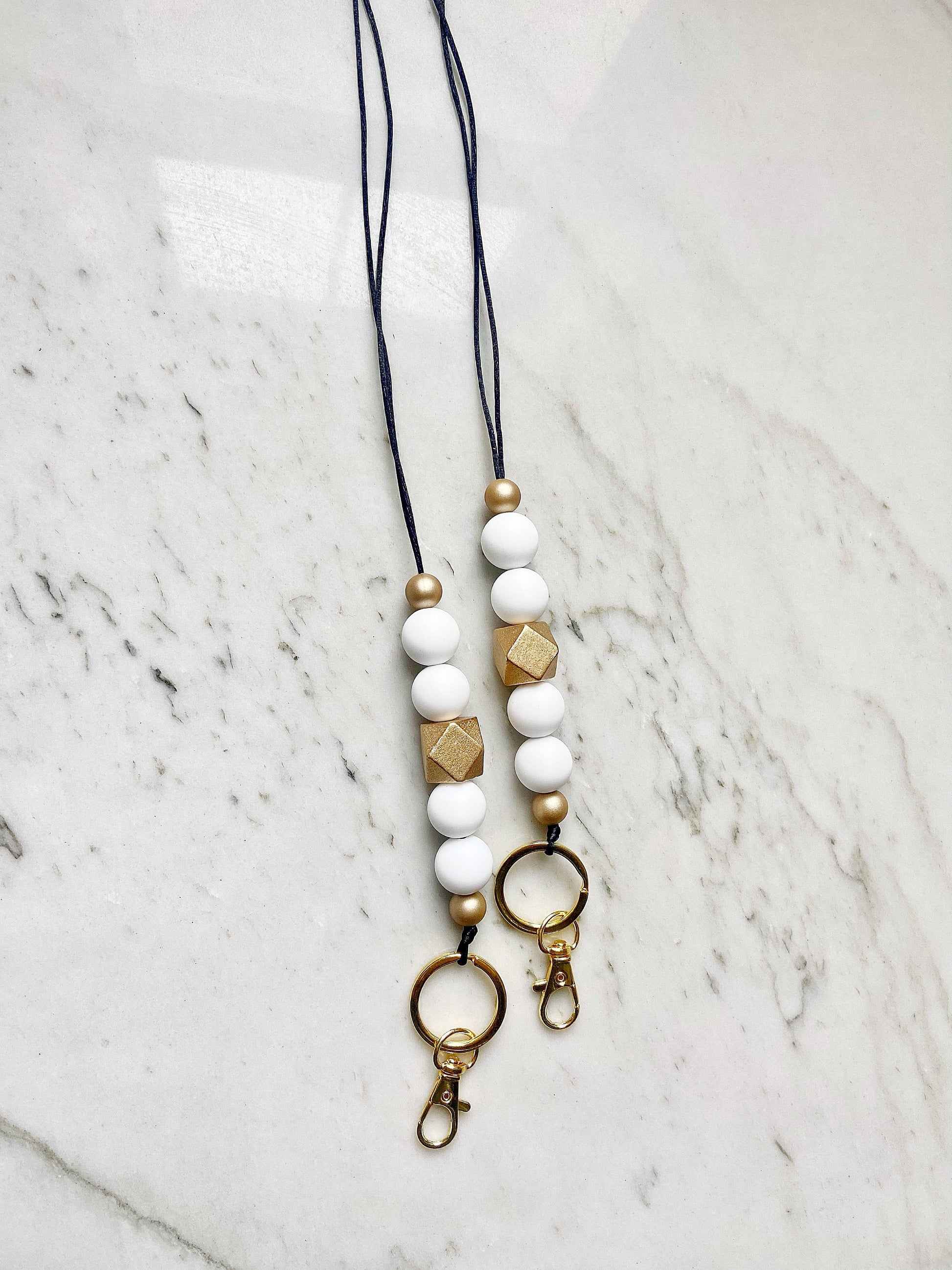 This lanyard is made with four 15 mm silicone beads, one gold wooden hexagon bead, two 12 mm gold silicone beads, split ring, clasp. The lanyard makes it easy for you to attach your keys, nurse/school ID, or anything you need easily accessible throughout your day! The lanyard hangs on black premium quality nylon satin cord. *Please Note* We do our best to represent our lanyards as accurately as possible. Colors may vary slightly between your computer and the final product you receive. Send us a message if you have any questions! Follow us on Instagram @lanyardlovebirds