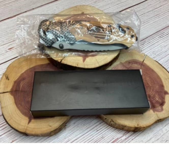 Laser engraved folding tactical knife with lock blade, great for any outdoor activity. The handles are made from natural olive wood with unique grain patterns, making them all a one of a kind. Each knife comes in a plastic sleeve and gift box.