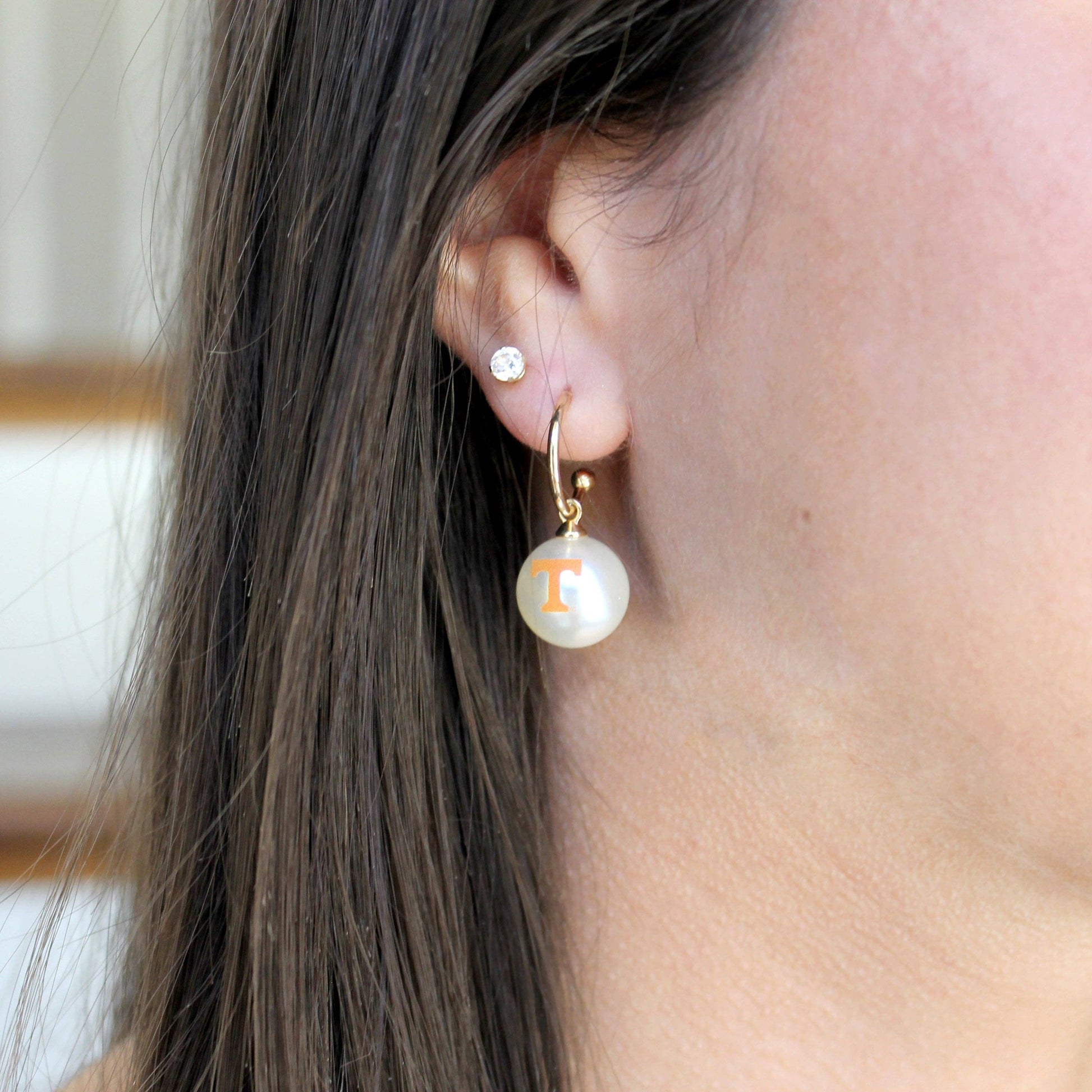 Gold tone hoop earrings with Florida logo pearl accents. Pearls are 14mm in size. Hoops measure approximately a half inch in diameter.