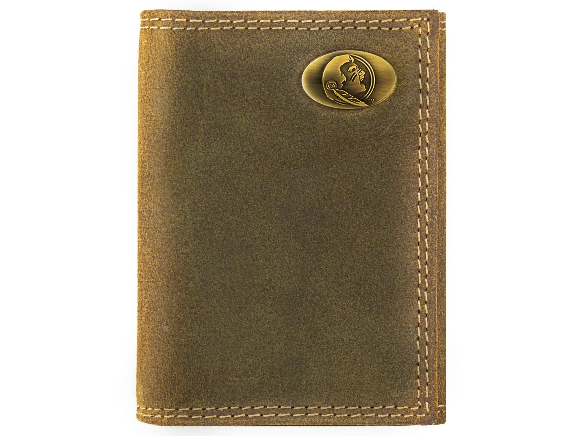 Show your Florida State Seminoles pride with an original Zep-Pro collegiate vintage tan leather trifold wallet. This accessory is popular among college students and alumni. It is a stylish and unique way to show enthusiasm while keeping important cards and cash organized. This Zep-Pro wallet is constructed of full grain leather with a vintage tan finish and features the school’s official logo, proudly displayed on the front upper right corner. The metal concho emblem has an antique brass finish which perfectly accents this unique wallet.