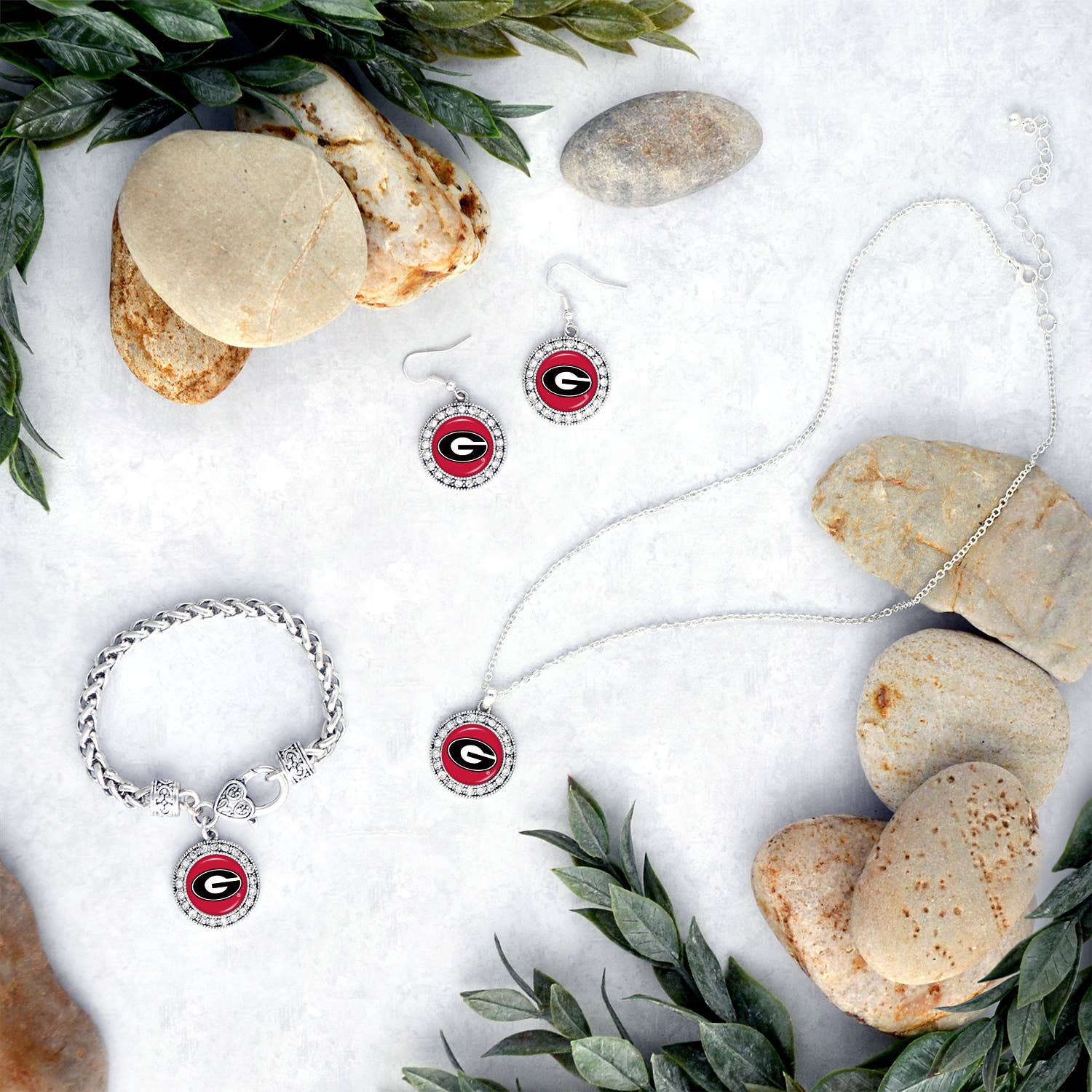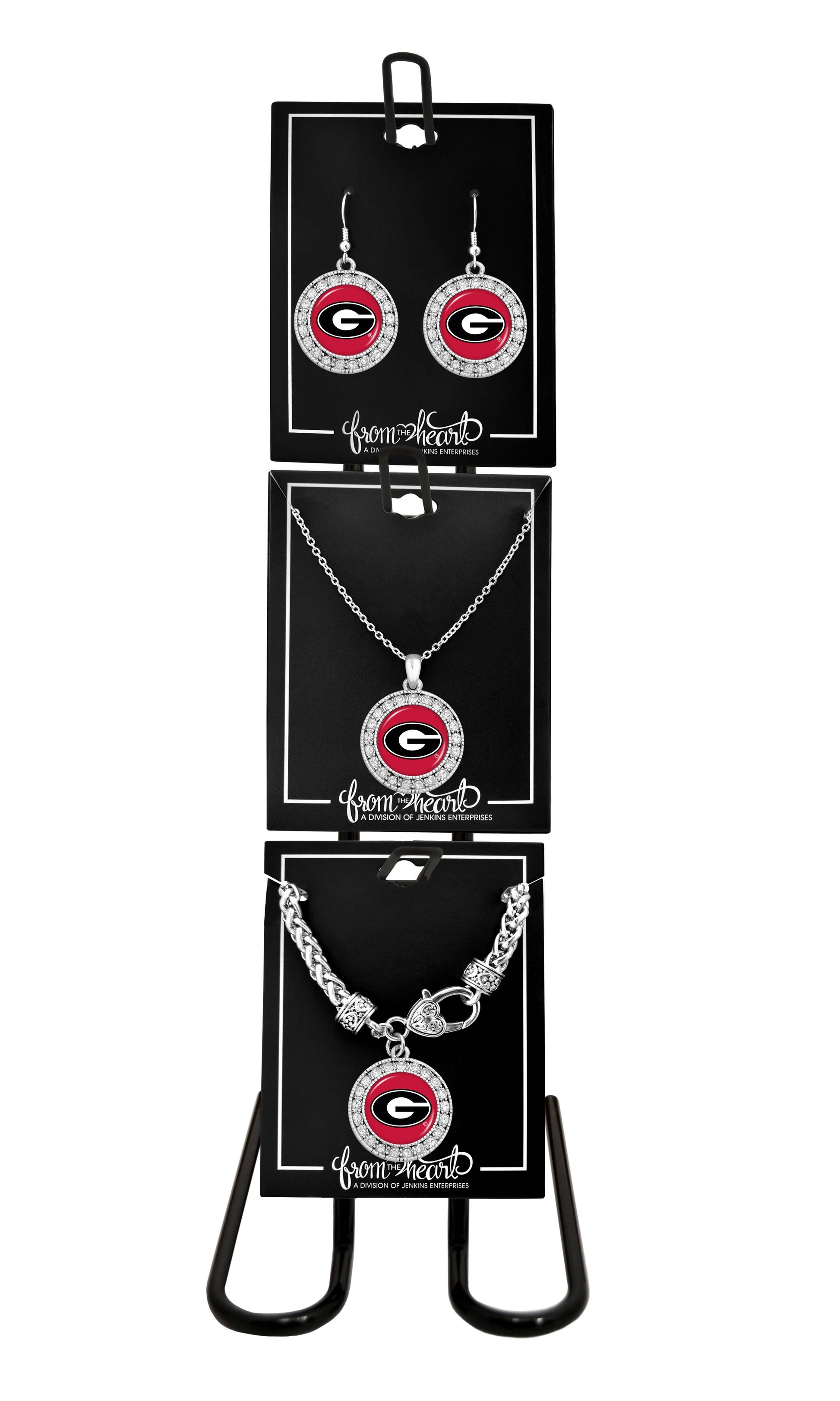 If you are a girl who loves a little extra bling in your life, then you need our Kenzie college jewelry collection! The collection is a show stopper! With dramatic strong graphics and a ring of bling, this collection has become one of our best sellers! Treat yourself to something sparkly! The earrings feature a french hook style post. The necklace is an 18 inch cable chain with a two inch extender so you can customize your length. The bracelet is a mesh link with a braided lobster clasp closure. All items are made from zinc alloy and are sealed with a anti-tarnish coating.  Each piece is designed and assembled  by working moms and grandmothers at our production office just outside Tulsa, Oklahoma. Some components are Made in China then assembled proudly in the USA.