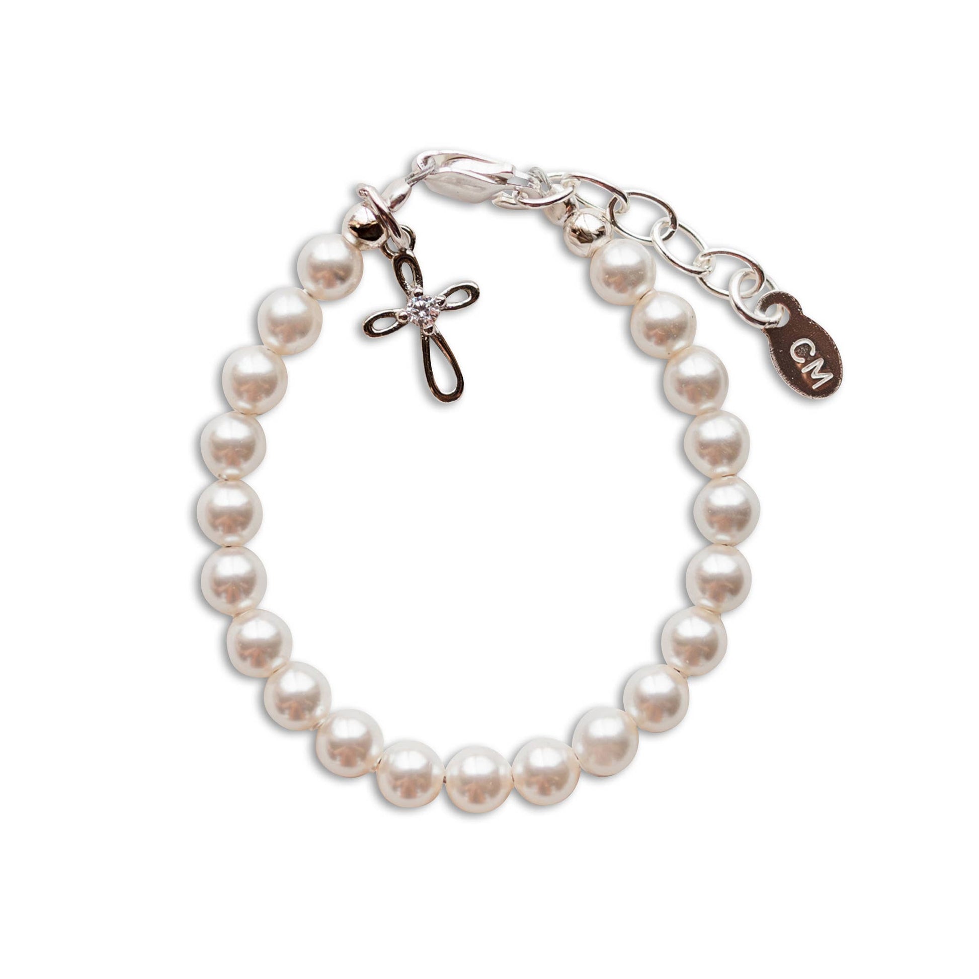 Beautiful keepsake sterling silver bracelet with soft white high-end Austrian simulated pearls and a silver infinity cross charm - perfect for baptisms, christenings, and holy first communion! Each bracelet has an extension chain, as the child grows just move to the next link for a perfect fit. This bracelet is available in three sizes and is great for infants, babies, toddlers, and older girls. This cross bracelet comes in a beautiful gift box and will be a keepsake she will cherish Forever.