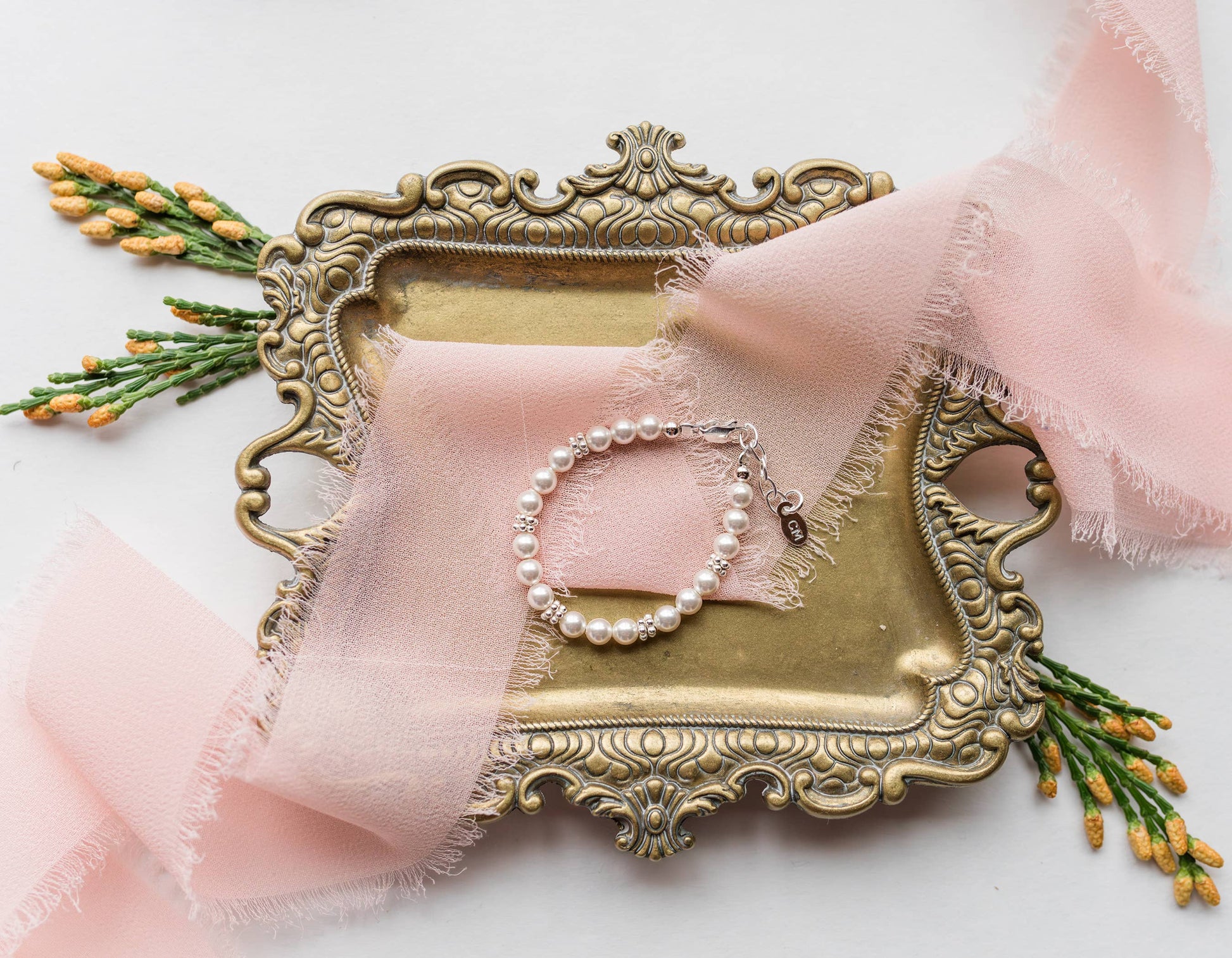 Luxurious sterling silver bracelet with beautiful soft white high-end Austrian simulated pearls accented with shimmering silver daisies. Each bracelet has an extension chain, as the child grows you just move to the next link for a perfect fit. This bracelet is available in three sizes and is great for infants, babies, toddlers, and kids. This jewelry comes in a beautiful gift box and is hand made in the USA!