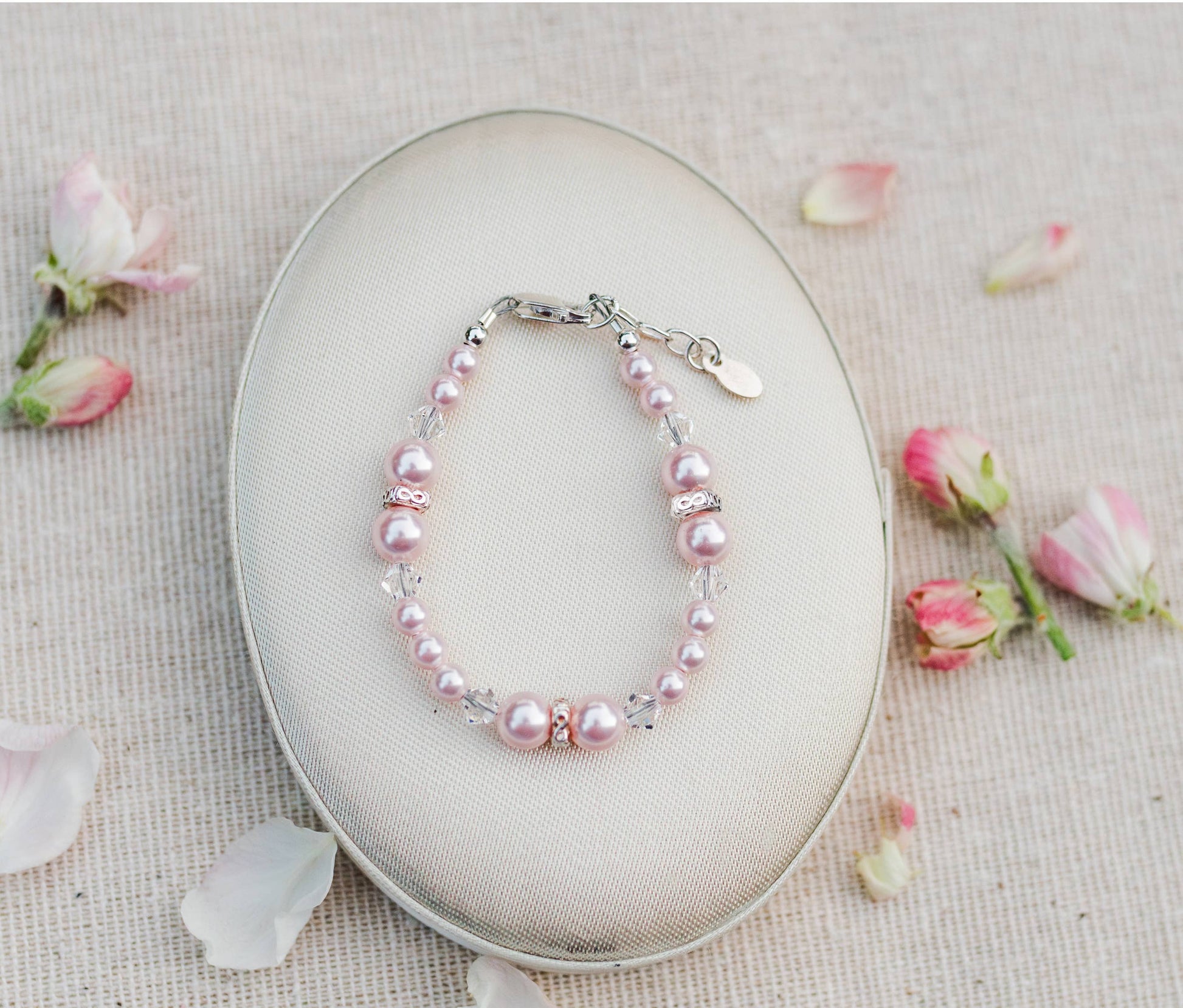 Gorgeous bracelet with beautiful pink high-end Austrian simulated pearls and crystals accented with sparkling silver rondelles. A wonderful gift for your trendy little one. Each bracelet has an extension chain, so as the child grows you just move to the next link for a perfect fit. This bracelet is available in three sizes and is great for infants, babies, toddlers, and kids. This jewelry comes in a beautiful gift box.