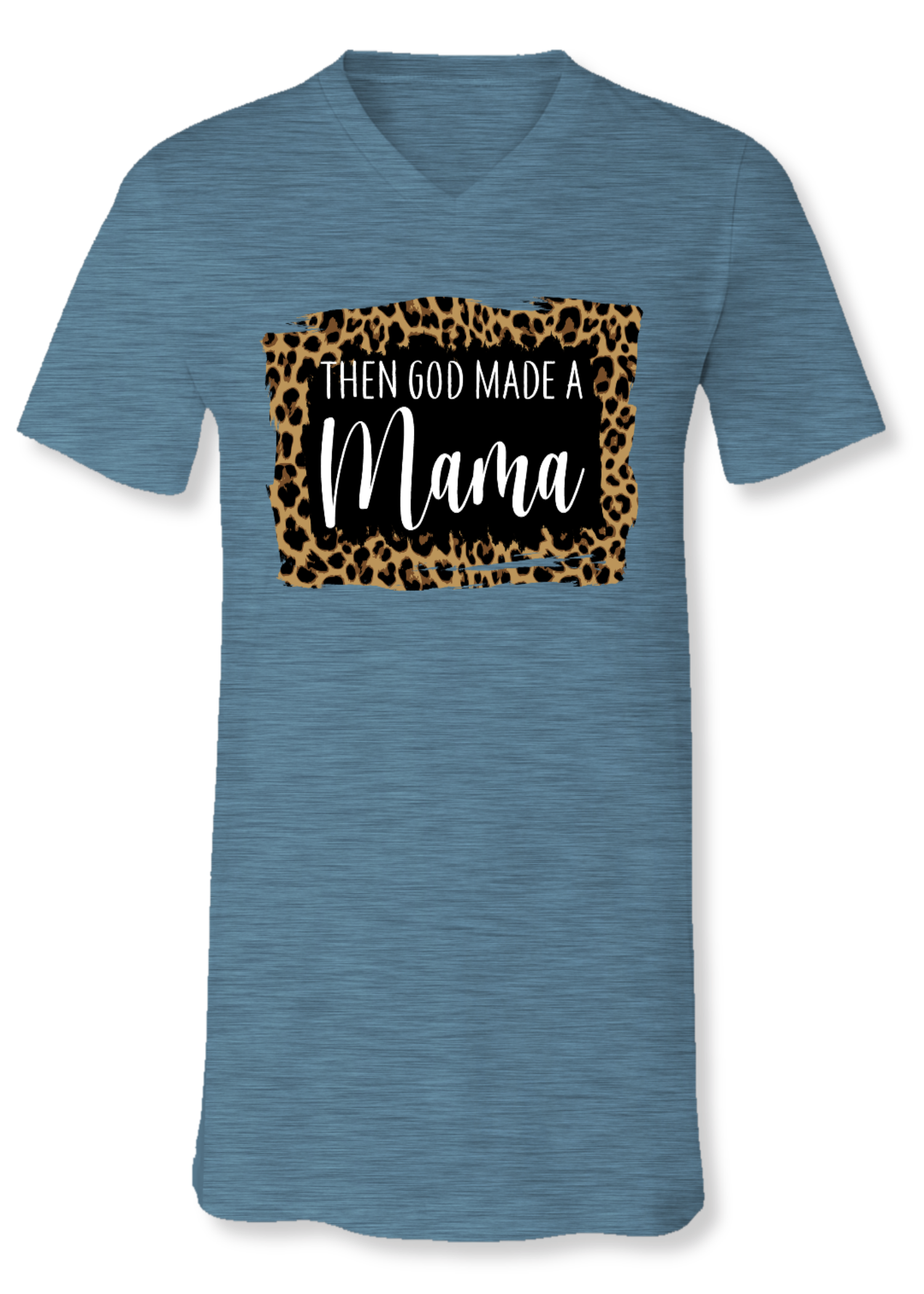God Made A Mama on Bella Canvas V-neck tee in Deep Teal with leopard print accents! This is a unisex-fit tee available in sizes S-3X.