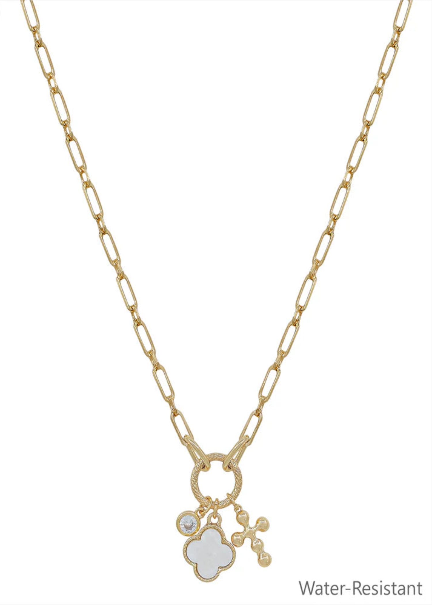 Gold Chain with Clover, Crystal, Cross Charms 16"-18" Necklace