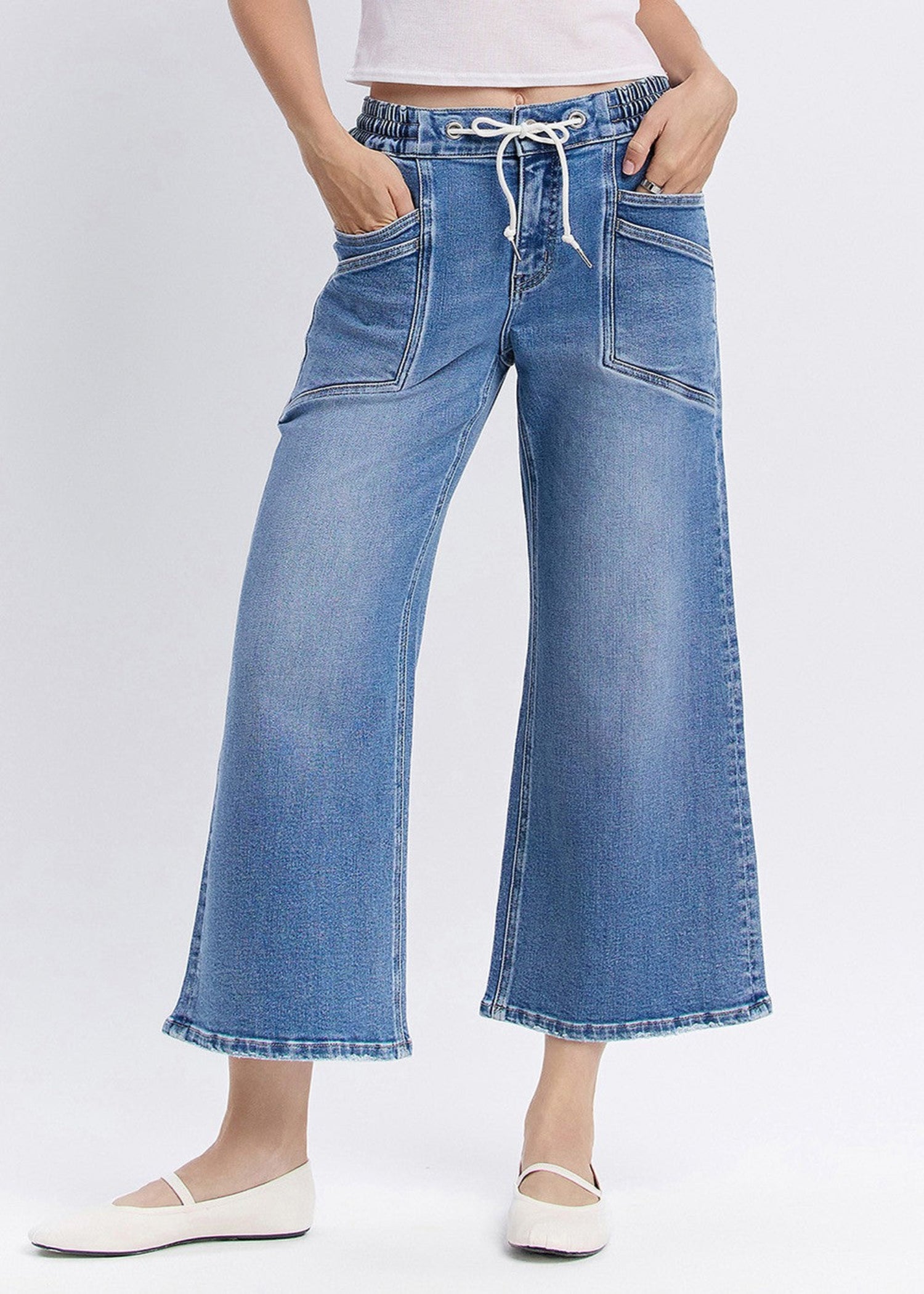 Comfort stretch denim, high rise waist, drawstring waistband, finished hem, cropped length, wide leg jeans.