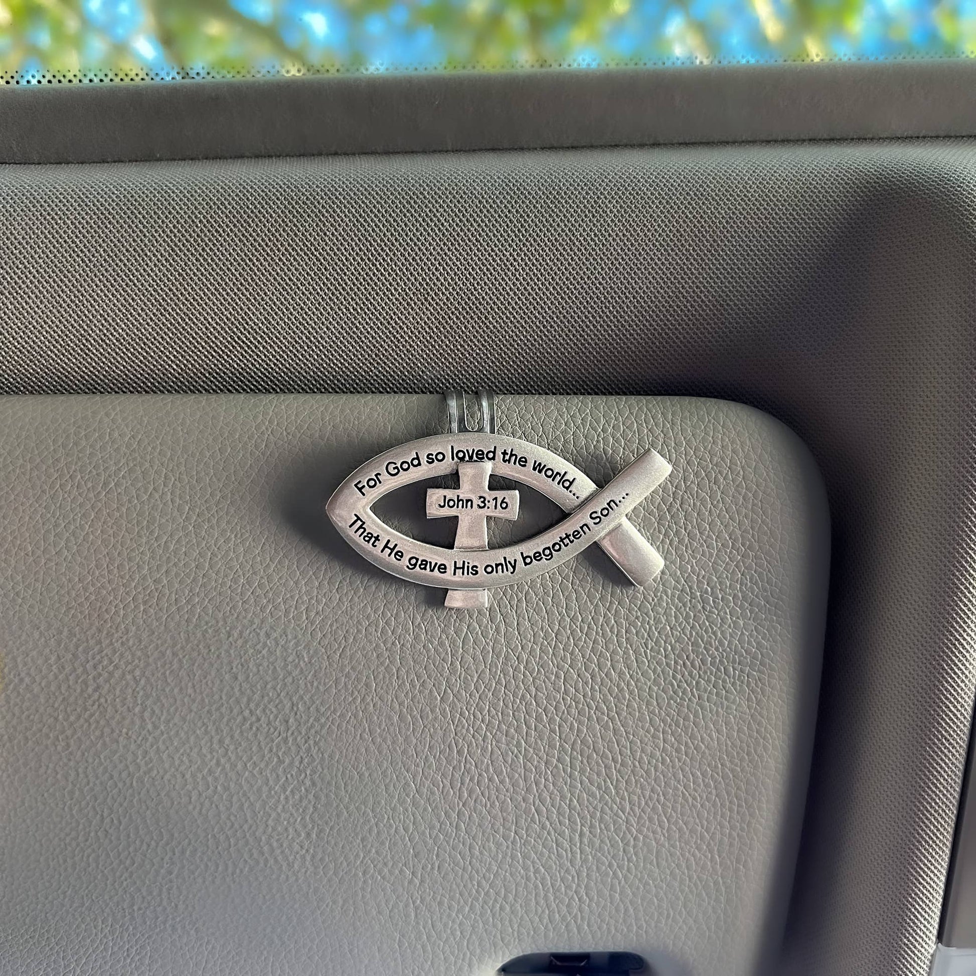 Auto visor clip in silver enamel finish. Ichthus cross with message “For God so loved the world… That He gave His only begotten Son… John 3:16”. Attach to car or truck visor to hold papers, and bring protection on your travels. 1 ½”H x 2 ⅞”W. Carded.