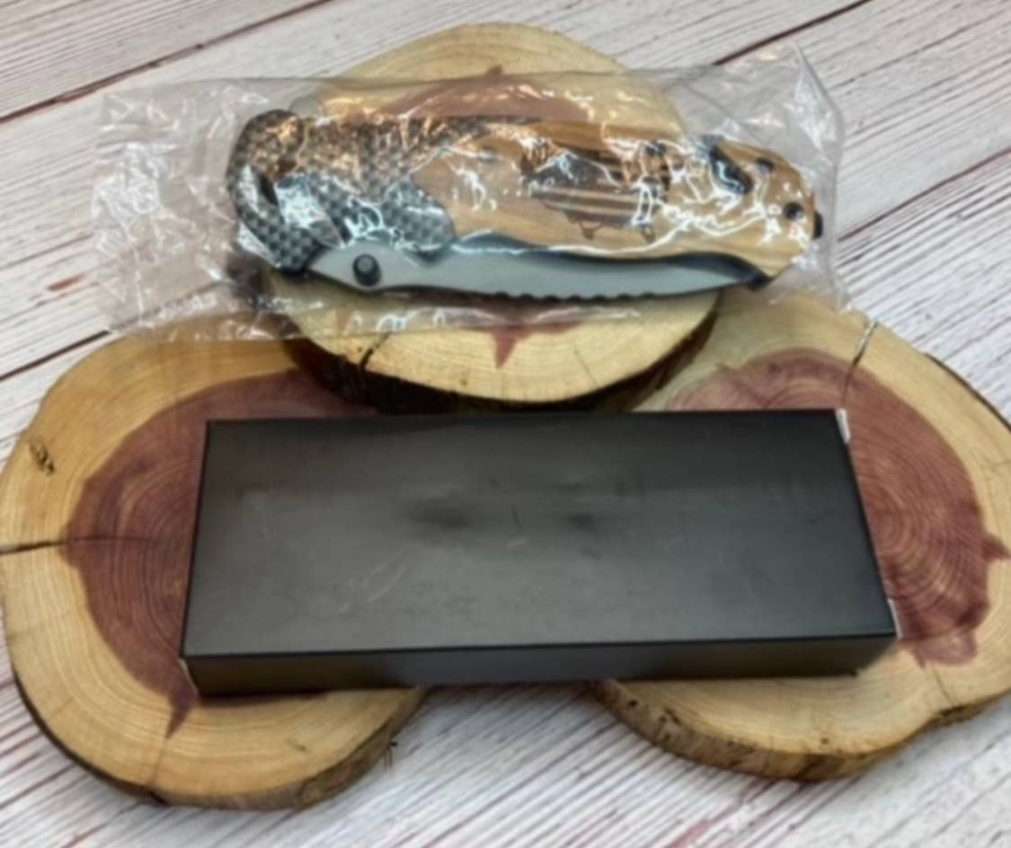 Laser engraved folding utility knife with lock blade, great for any outdoor activity. The handles are made from natural olive wood with unique grain patterns, making them all a one of a kind. Each knife comes in a plastic sleeve and gift box.