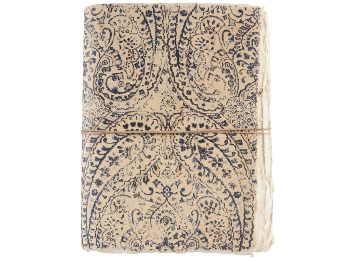 A decorative journal displaying an indigo paisley pattern on a textured paper cover. Inside contains 96 unlined pages featuring deckled edges and an aged aesthetic to pen anything that is desired. Our Indigo Paisley journal includes wrap-around jute tie closure to keep secure. A decorative and functional everyday home accent perfect for any home office or desk.