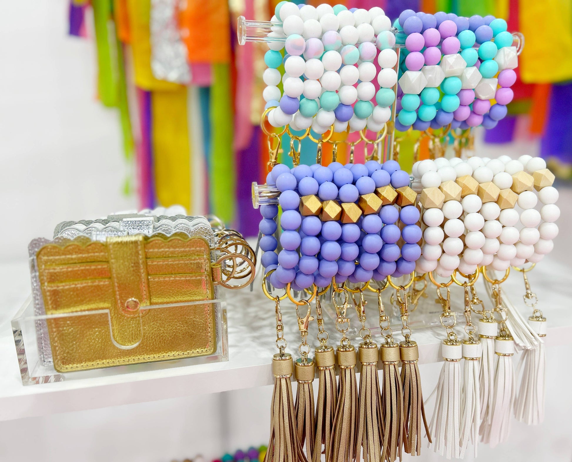 The wristband keyring is made with silicone beads, split ring, clasp, and leather tassel. The wristband keychain makes it easy for you to have your keys and wallet attached to your wristband, which easily slides onto your wrist! In the drop down box, please chose the wallet option you would like. Feel free to message us if you have any questions. Refer to the listing photos for tassel types and tassel colors.
