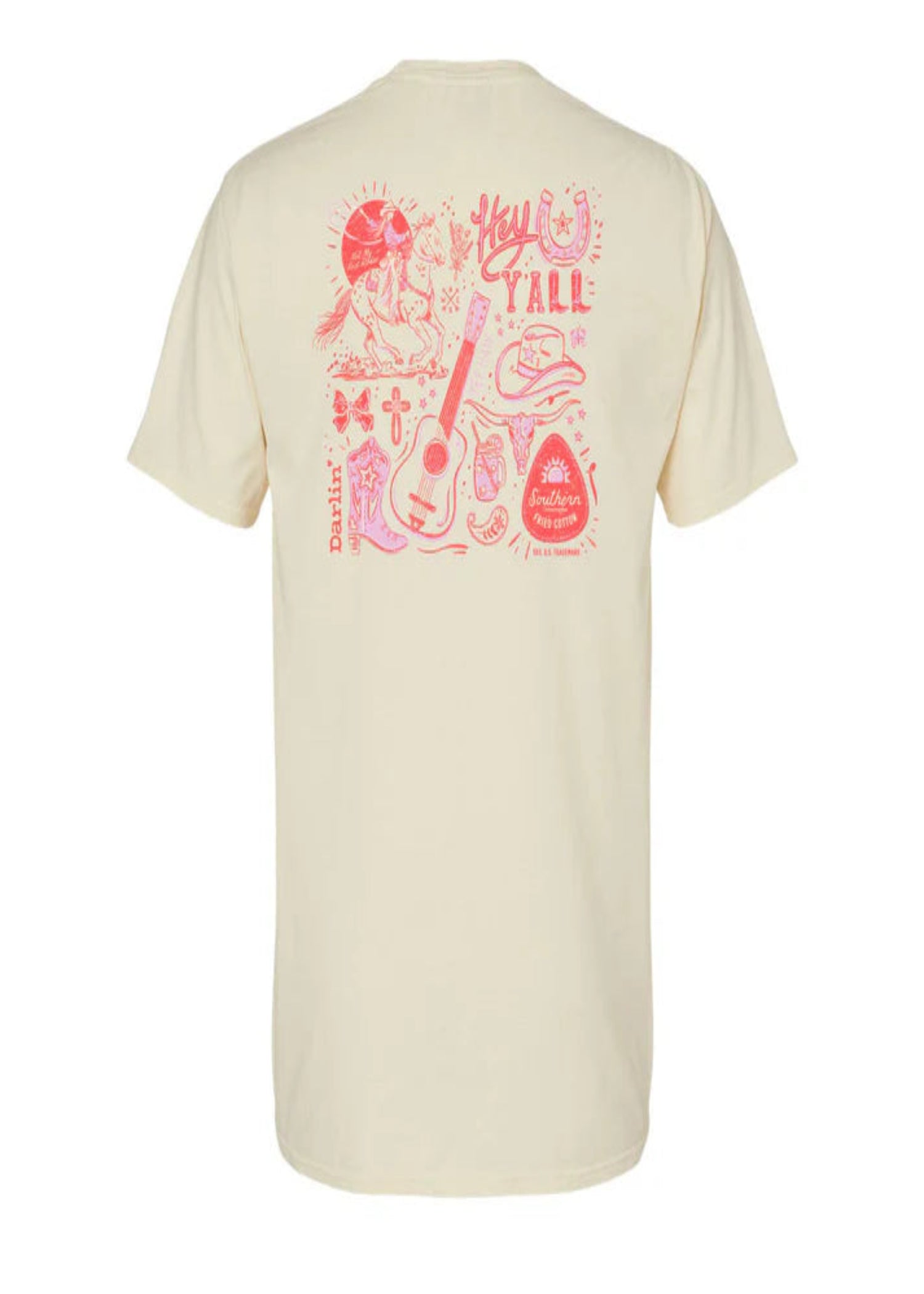 Embrace your cowgirl spirit with the Long Live Cowgirls graphic tee! This short-sleeved shirt features a playful design with a guitar, cowgirl boots, hat, and horseshoe, celebrating the bold and free-spirited lifestyle. Whether it's rodeo days or country nights, show off your Southern strength with style.