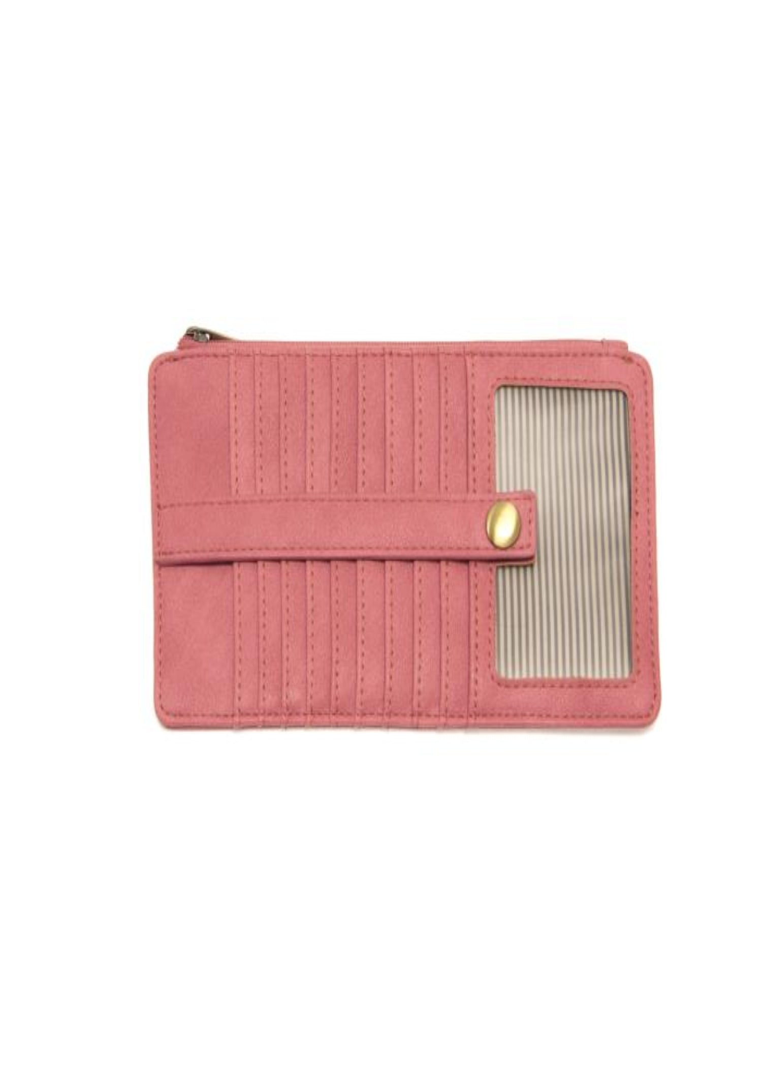 This slim and sleek card wallet has 9 credit card pockets, an ID window, zippered change pocket and zippered billfold pocket all in casual distressed Vegan Leather available in a kaleidoscope of beautiful colors.