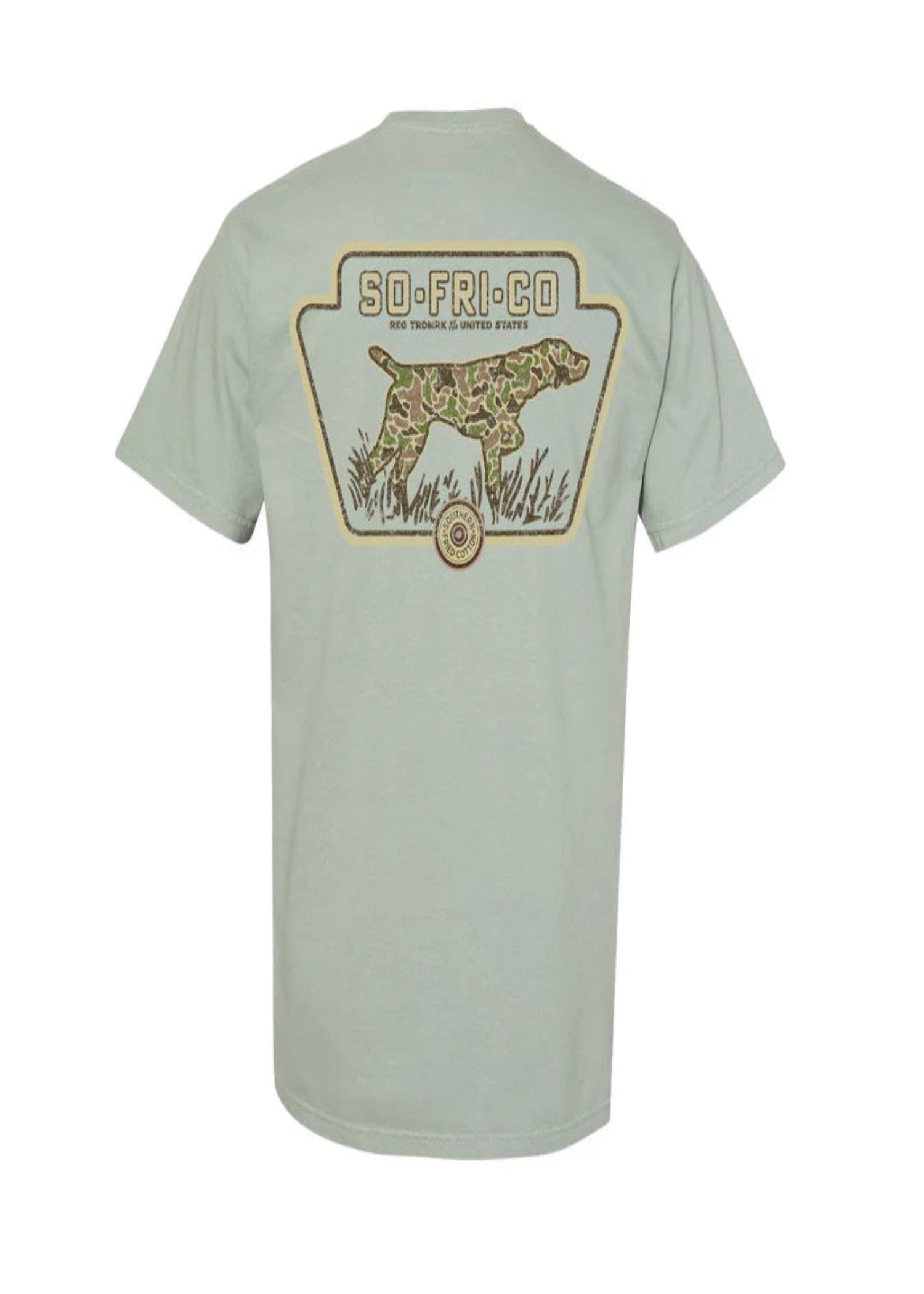 Old school style meets outdoor grit. This tee sports a vintage-inspired camp badge with a camo-filled pointer dog front and center. Soft, easy to wear, and Southern to the bone.