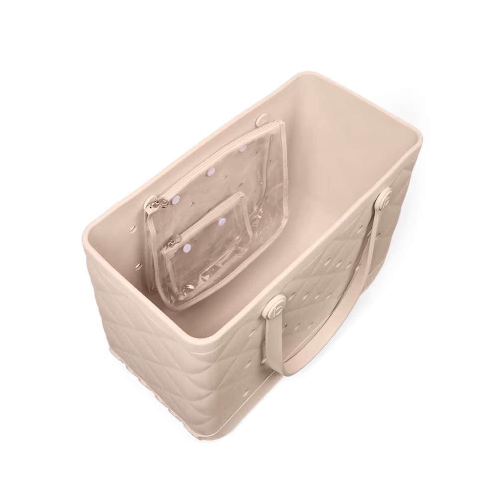 Durable and tip-proof, it stands upright, wipes clean, and keeps up with whatever your day throws at it. Sand brushes off. Spills don’t stick. Includes two clear insert bags—perfect for organizing smaller essentials like your phone, sunscreen, keys, or snacks.