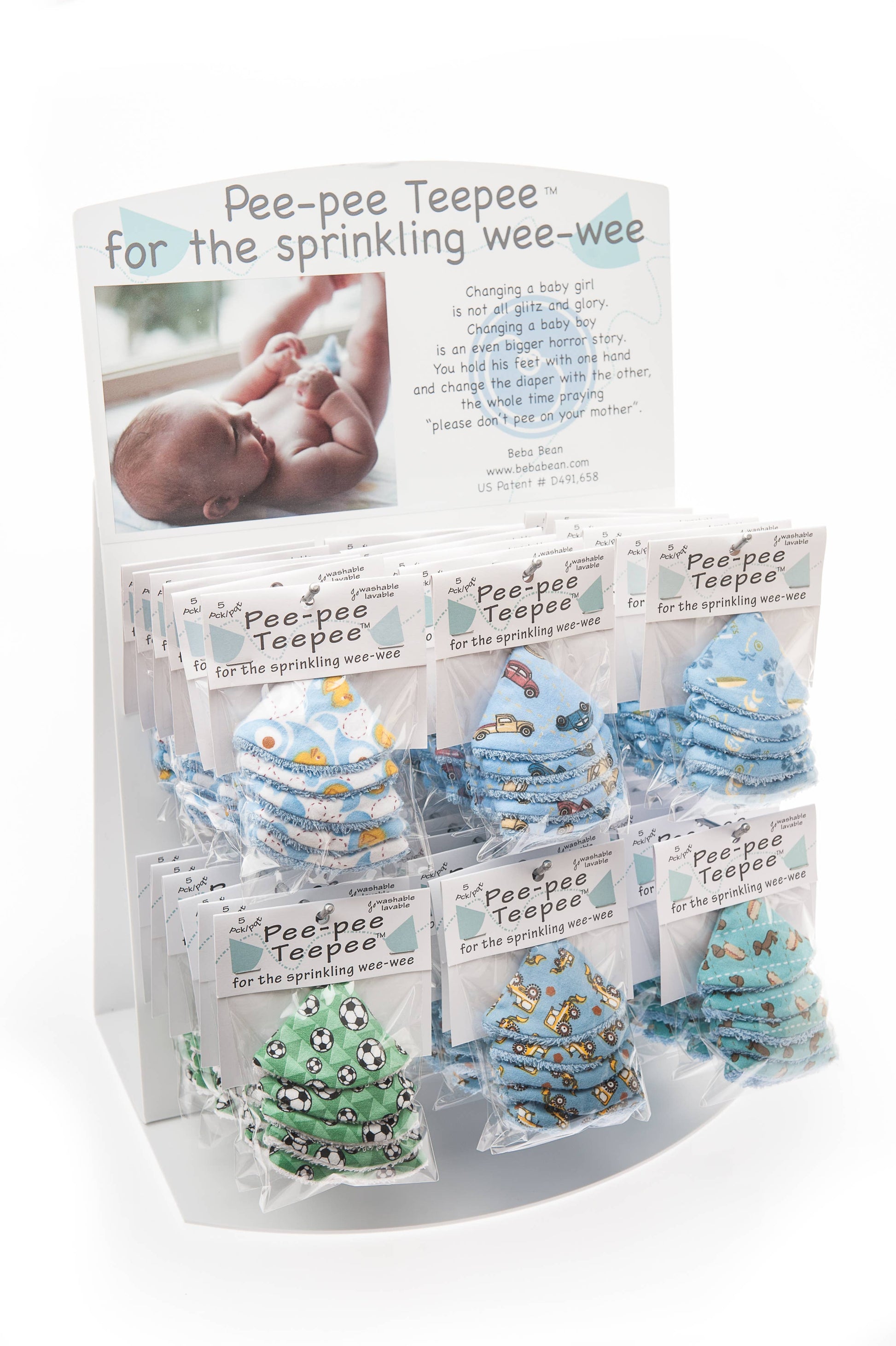 With each pack of five Pee-pee Teepees, you have the choice of a flannel laundry bag or cellophane packaging.
