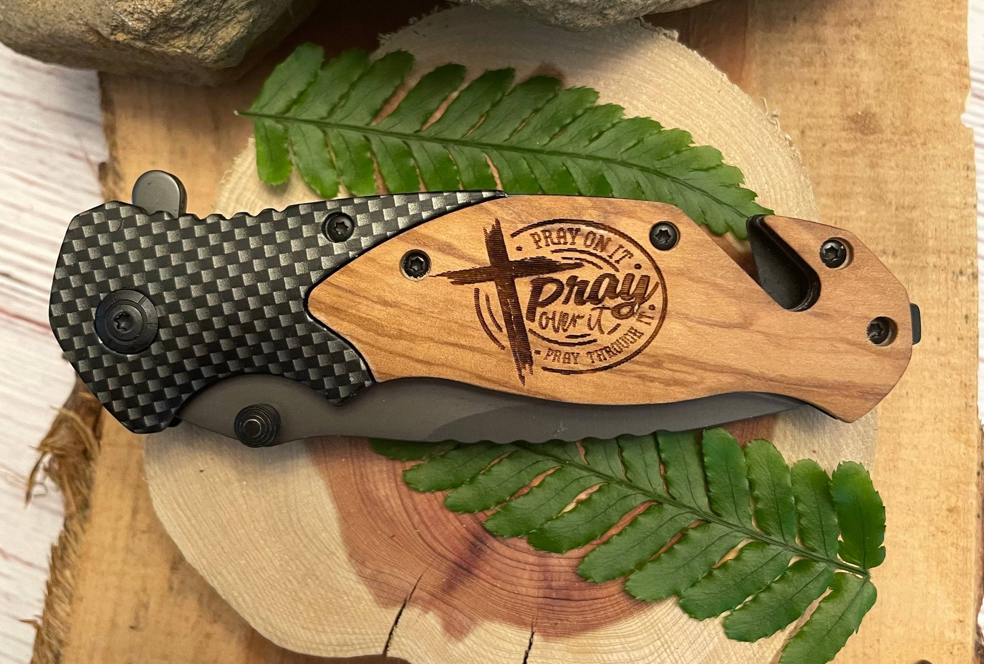 Laser engraved folding utility knife with lock blade, great for any outdoor activity. The handles are made from natural olive wood with unique grain patterns, making them all a one of a kind. Each knife comes in a plastic sleeve and gift box.