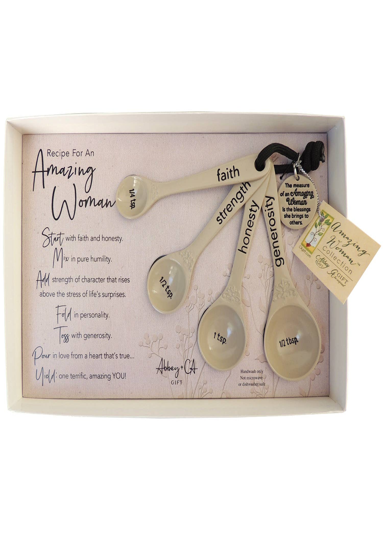 4 measuring spoons in ivory color enamel finish, from ¼ tsp. to ½ tbsp. Include words on each spoon from the recipe for an amazing woman. Hand wash only. Gift boxed.