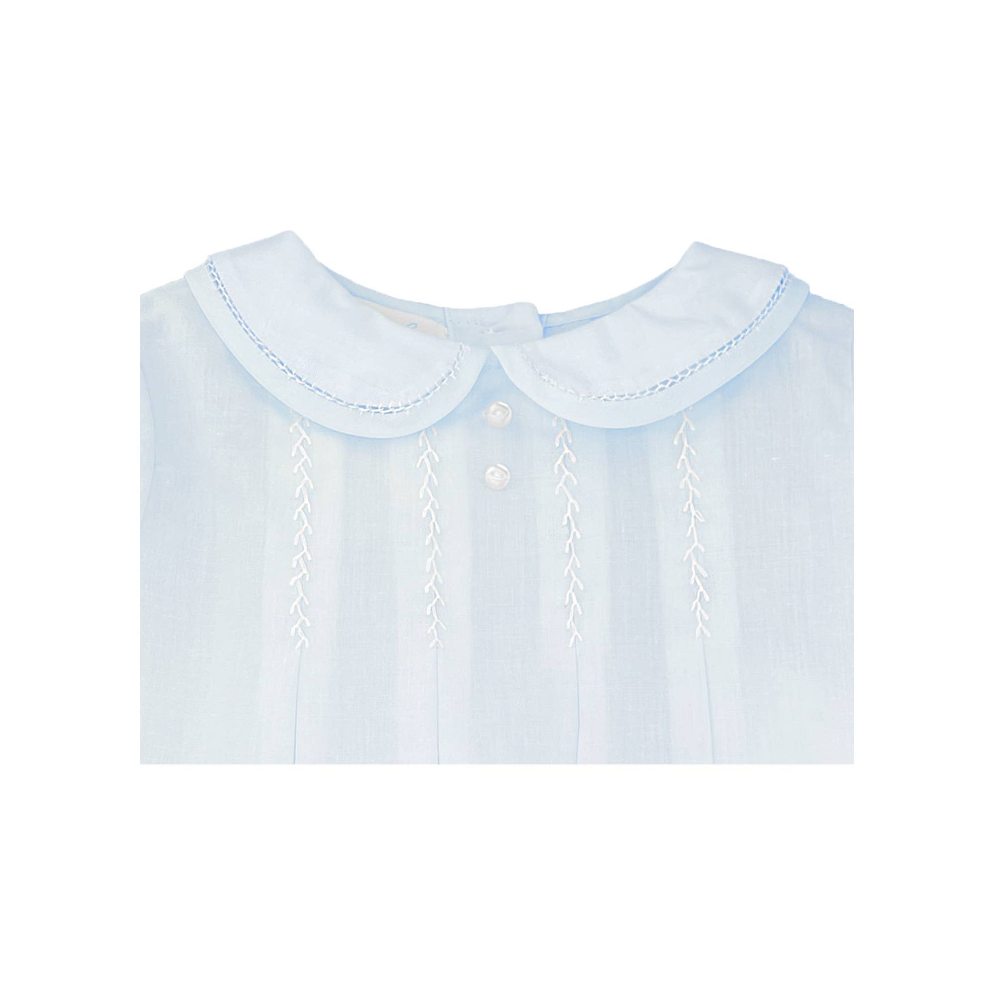 This piece is as sweet as if it were pulled out of your grandmother’s cedar chest and is sure to become a treasured keepsake. Featuring heirloom-quality handcrafted details like inverted pleats and hand-embroidered feather stitches.