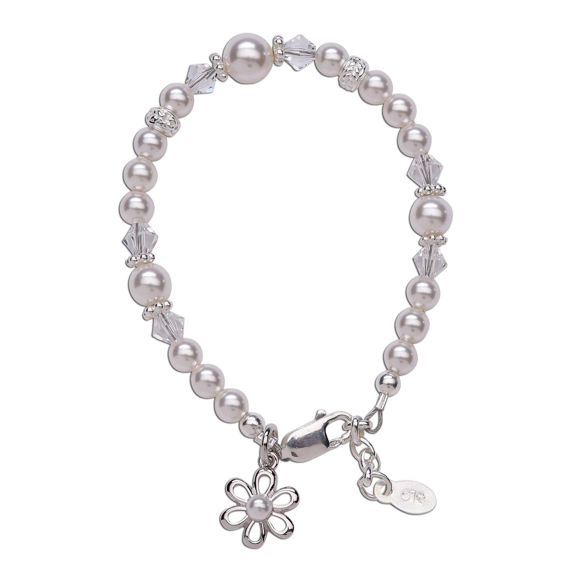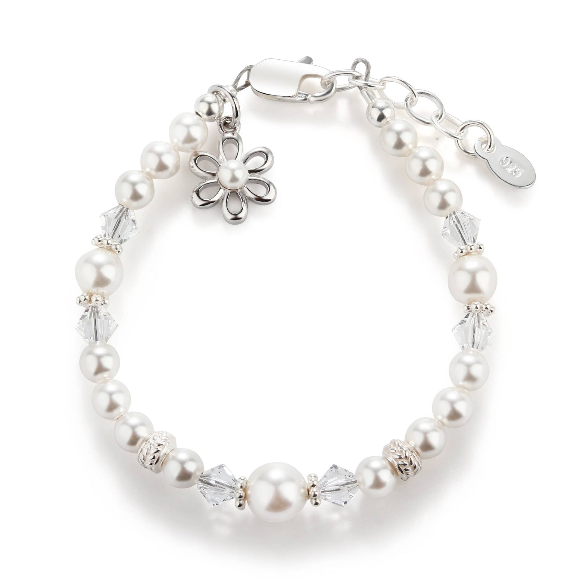 Sterling Silver white high-end simulated pearl bracelet with daisy charm accented with tiny pearl and sparkling high-end crystals. This is a beautiful flower girl bracelet or gift for children, kids, toddlers, and little girls. Bracelet comes in a beautiful black/pink gift box.