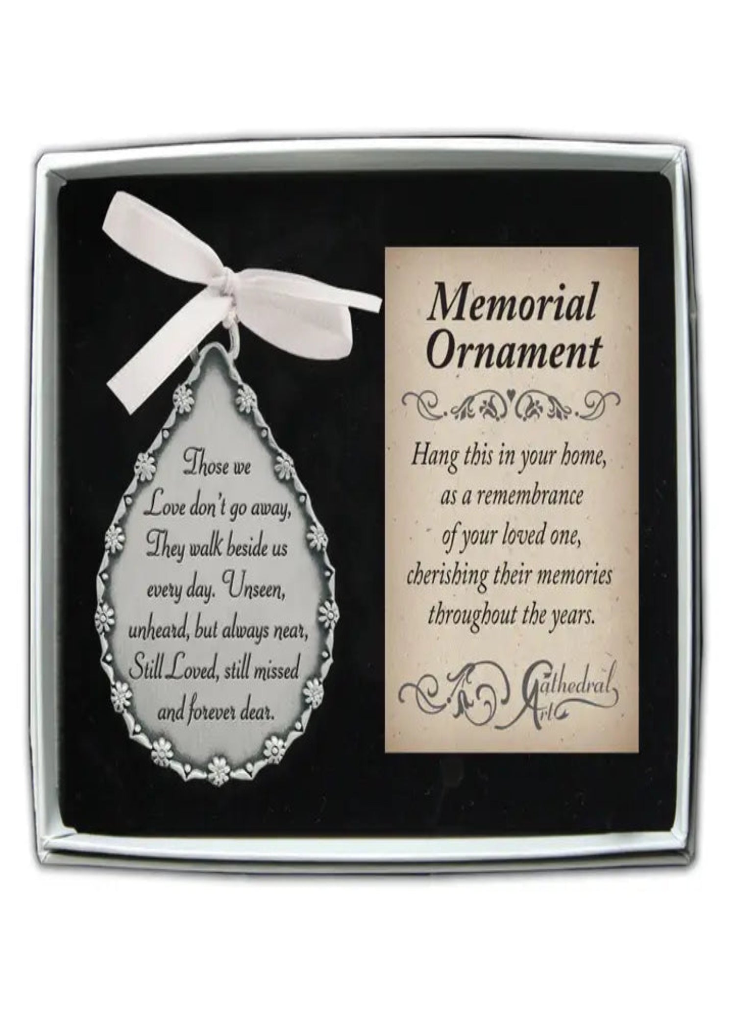 Tear drop shape memorial ornament in silver enamel finish. Featuring message, “those we love don't go away, They walk beside us every day. Unseen, unheard, but always near, Still Loved, still missed. and forever dear.“ Hangs from white satin ribbon Space to engrave on back. Window boxed.