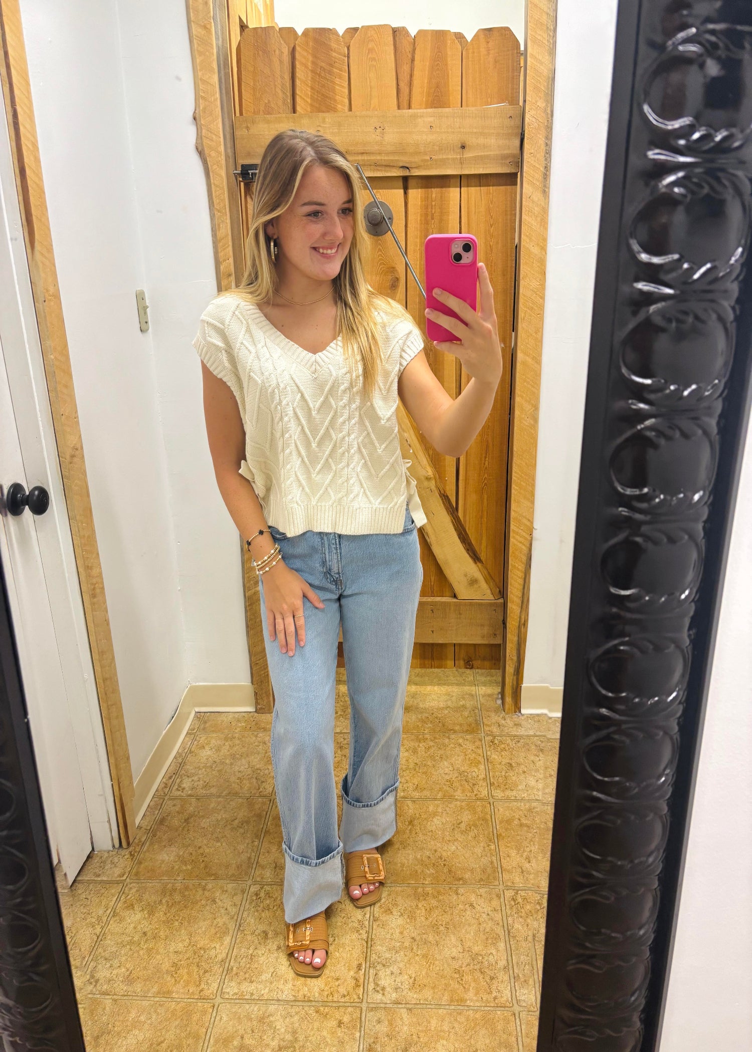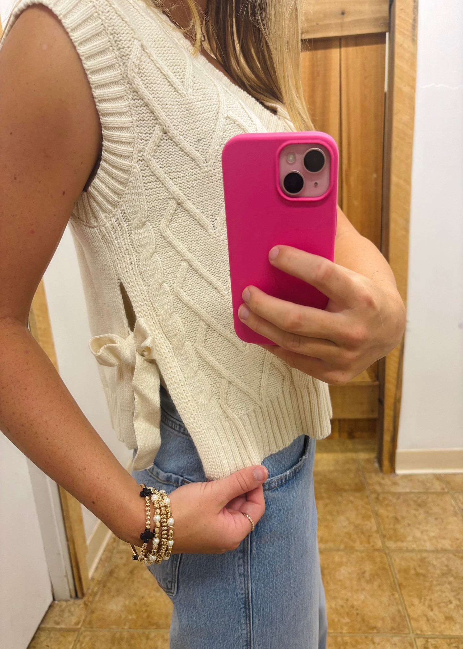 Elevate your wardrobe with the Veronica Sweater in cream. This sleeveless V-neck sweater features delicate bows on the side, adding a charming and feminine touch to a classic silhouette. Perfect for layering or wearing on its own, it offers both style and comfort for any occasion.