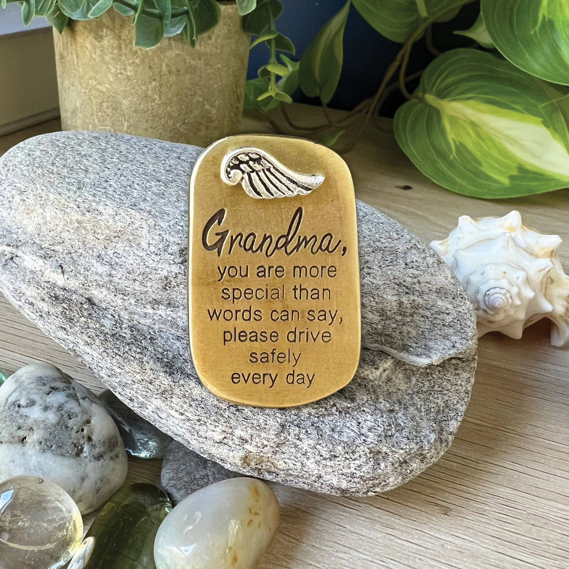 Cast metal dog tag shape with hematite ring and chain, wood bead, and metal charm, finished in silver, gold, or copper enamel.