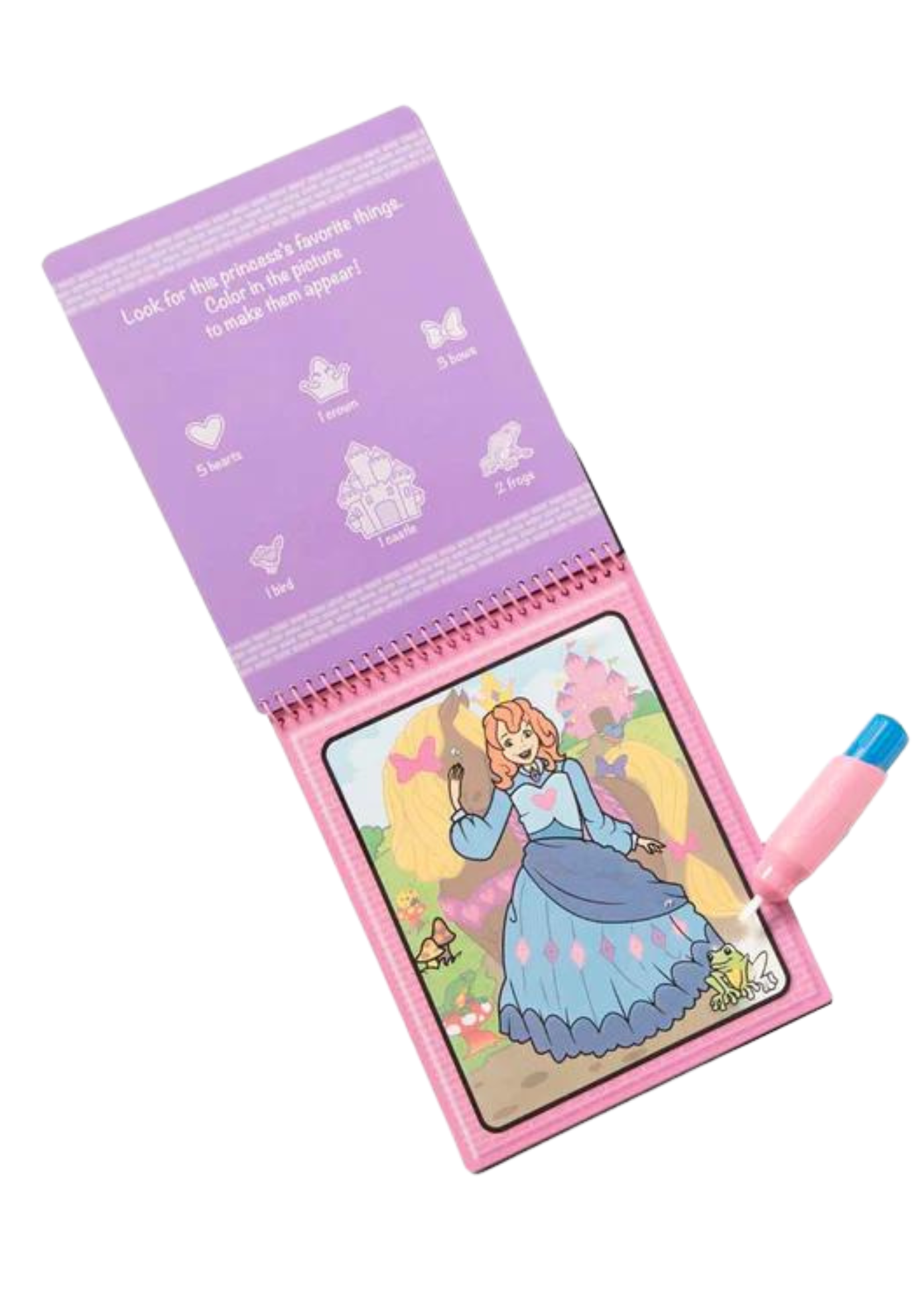 - Reusable white pages feature simple line drawings when dry; filled with color when wet