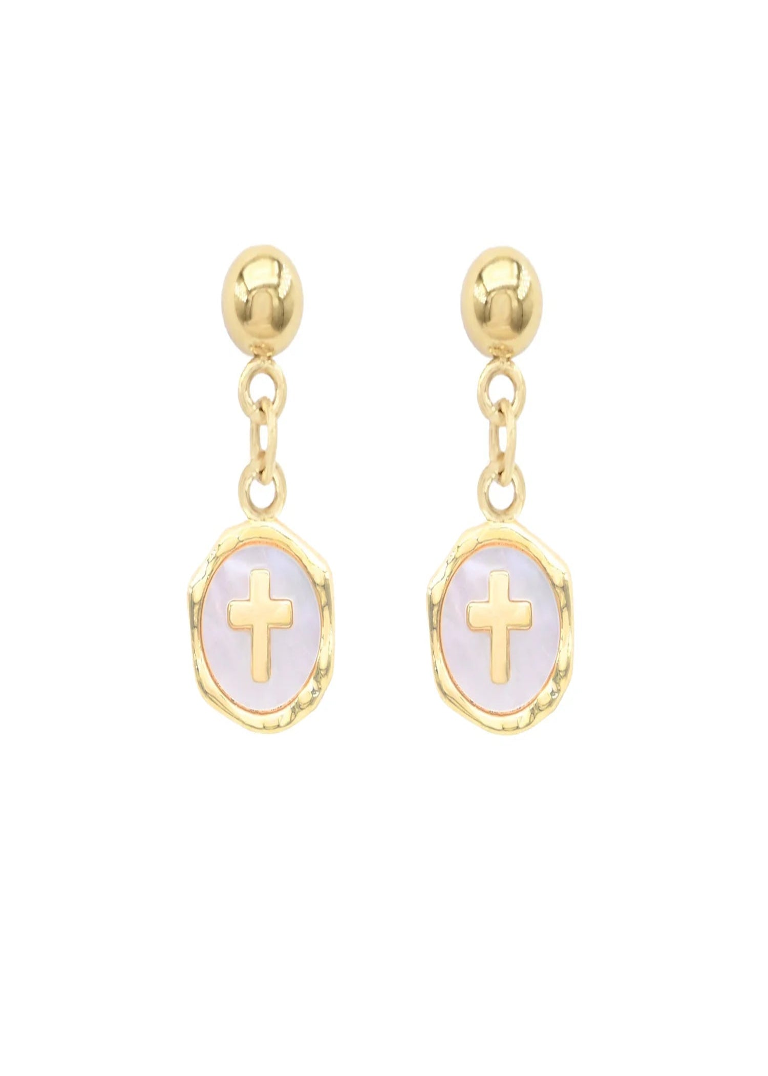 Waterproof Stainless-Steel Pearlized Circle with Gold Cross 1" Stud Drop Earring